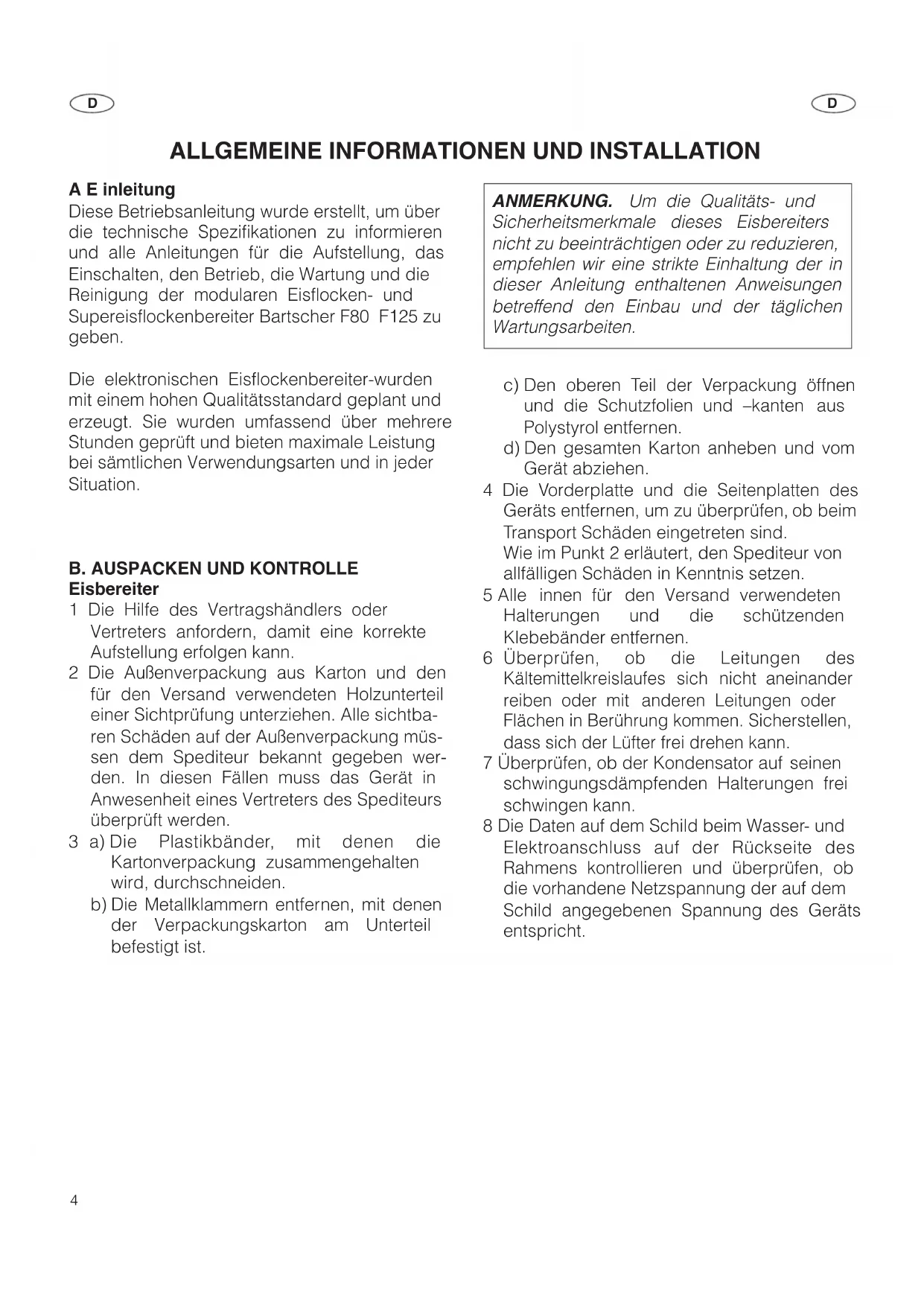 A E inleitung Diese Betriebsanleitung wurde erstellt, um über die technische Spezifikationen zu informieren und alle Anleitungen für die Aufstellung, das Einschalten, den Betrieb, die Wartung und die Reinigung der modularen Eisflocken- und Supereisflockenbereiter Bartscher F80 F125 zu geben. Die elektronischen Eisflockenbereiter-wurden mit einem hohen Qualitätsstandard geplant und erzeugt. Sie wurden umfassend über mehrere Stunden geprüft und bieten maximale Leistung bei sämtlichen Verwendungsarten und in jeder Situation.