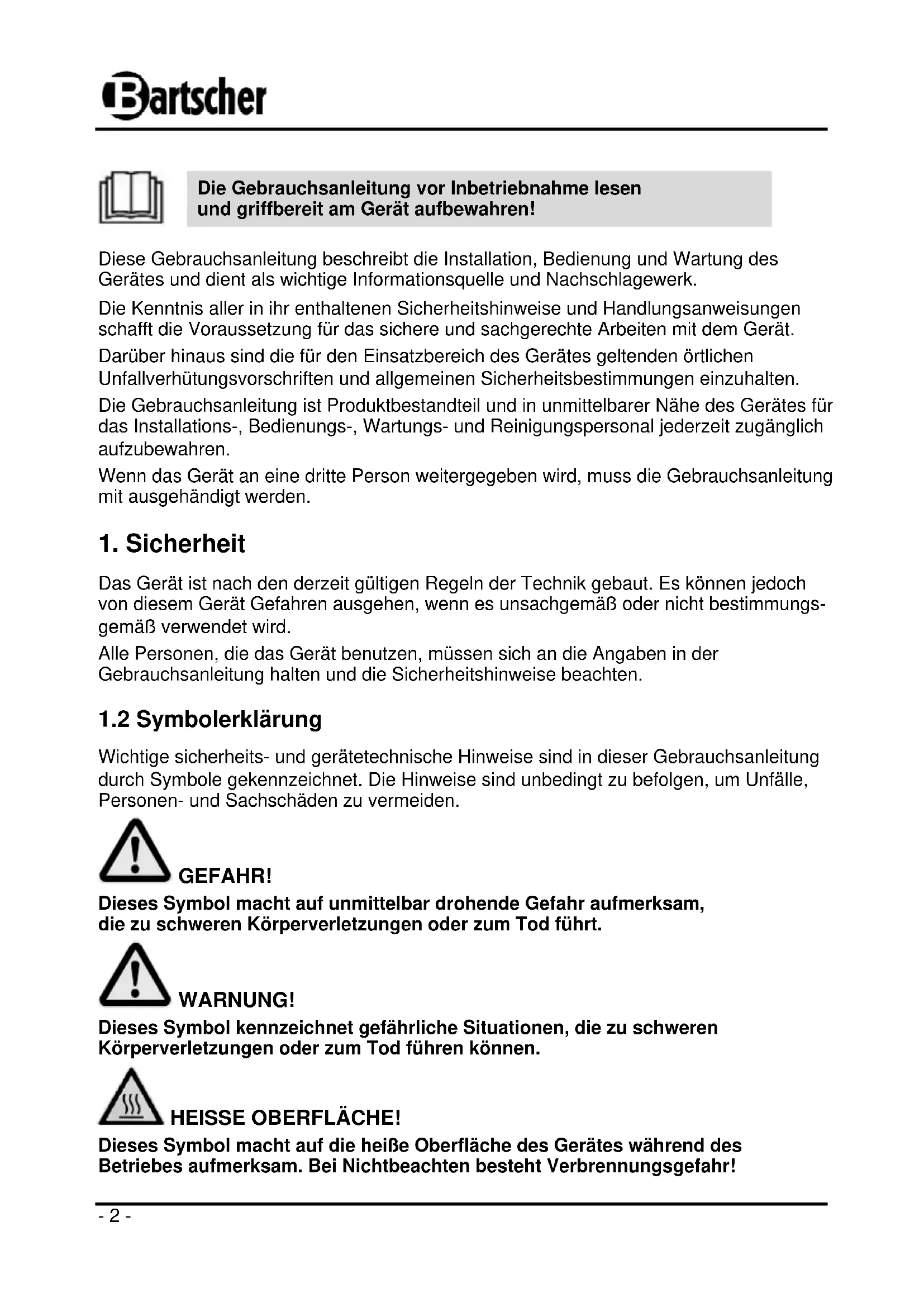 Bartscher GmbH Franz-Kleine-Str. 28 33154 Salzkotten Tel.: +49 (0) 5258 971-0 Service-Hotline: 0180 5 971 197 Germany Fax: +49 (0) 5258 971- 120 (14ct/Min. aus dem deutschen Festnetz) D/A/CH- 2 -