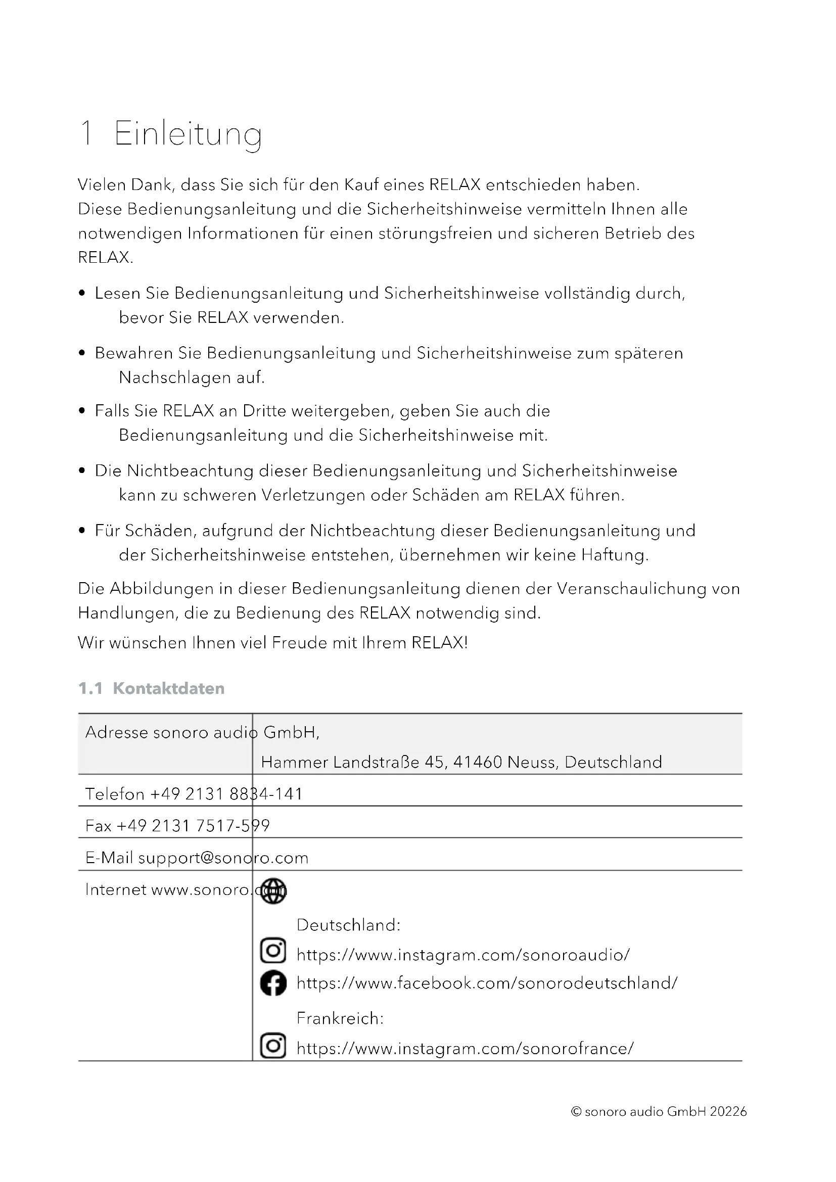 - 24 Garantie © sonoro audio GmbH 20226 1 Einleitung Vielen Dank, dass Sie sich für den Kauf eines RELAX entschieden haben. Diese Bedienungsanleitung und die Sicherheitshinweise vermitteln Ihnen alle notwendigen Informationen für einen störungsfreien und sicheren Betrieb des RELAX. p. 62