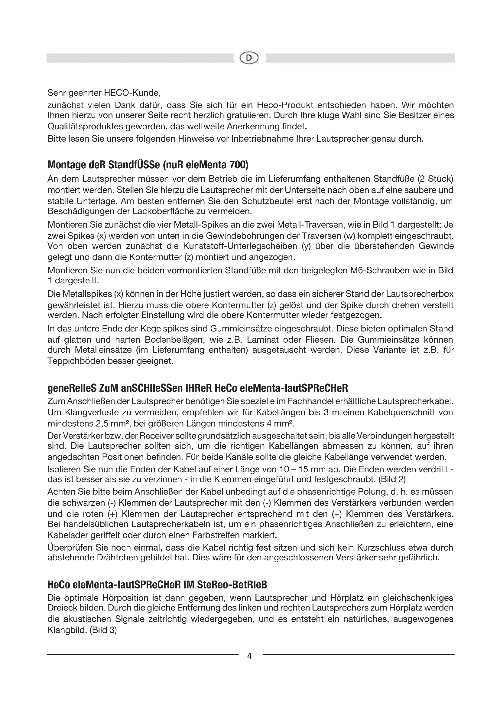 Abbildungen/Illustrations4 Sehr geehrter HECO-Kunde, zunächst vielen Dank dafür, dass Sie sich für ein Heco-Produkt entschieden haben. Wir möchten Ihnen hierzu von unserer Seite recht herzlich gratulieren. Durch Ihre kluge Wahl sind Sie Besitzer eines Qualitätsproduktes geworden, das weltweite Anerkennung findet. Bitte lesen Sie unsere folgenden Hinweise vor Inbetriebnahme Ihrer Lautsprecher genau durch. montage deR StandfüSSe (nuR elementa 700) An dem Lautsprecher müssen vor dem Betrieb die im Lieferumfang enthaltenen Standfüße (2 Stück) montiert werden. Stellen Sie hierzu die Lautsprecher mit der Unterseite nach oben auf eine saubere und stabile Unterlage. Am besten entfernen Sie den Schutzbeutel erst nach der Montage vollständig, um Beschädigungen der Lackoberfläche zu vermeiden. Montieren Sie zunächst die vier Metall-Spikes an die zwei Metall-Traversen, wie in Bild 1 dargestellt: Je zwei Spikes (x) werden von unten in die Gewindebohrungen der Traversen (w) komplett eingeschraubt. Von oben werden zunächst die Kunststoff-Unterlegscheiben (y) über die überstehenden Gewinde gelegt und dann die Kontermutter (z) montiert und angezogen. Montieren Sie nun die beiden vormontierten Standfüße mit den beigelegten M6-Schrauben wie in Bild 1 dargestellt. Die Metallspikes (x) können in der Höhe justiert werden, so dass ein sicherer Stand der Lautsprecherbox gewährleistet ist. Hierzu muss die obere Kontermutter (z) gelöst und der Spike durch drehen verstellt werden. Nach erfolgter Einstellung wird die obere Kontermutter wieder festgezogen. In das untere Ende der Kegelspikes sind Gummieinsätze eingeschraubt. Diese bieten optimalen Stand auf glatten und harten Bodenbelägen, wie z.B. Laminat oder Fliesen. Die Gummieinsätze können durch Metalleinsätze (im Lieferumfang enthalten) ausgetauscht werden. Diese Variante ist z.B. für Teppichböden besser geeignet. geneRelleS Zum anSCHlIeSSen IHReR HeCo elementa-lautSPReCHeR Zum Anschließen der Lautsprecher benötigen Sie spezielle im Fachhandel erhältliche Lautsprecherkabel. Um Klangverluste zu vermeiden, empfehlen wir für Kabellängen bis 3 m einen Kabelquerschnitt von mindestens 2,5 mm², bei größeren Längen mindestens 4 mm². Der Verstärker bzw. der Receiver sollte grundsätzlich ausgeschaltet sein, bis alle Verbindungen hergestellt sind. Die Lautsprecher sollten sich, um die richtigen Kabellängen abmessen zu können, auf ihren angedachten Positionen befinden. Für beide Kanäle sollte die gleiche Kabellänge verwendet werden. Isolieren Sie nun die Enden der Kabel auf einer Länge von 10 – 15 mm ab. Die Enden werden verdrillt - das ist besser als sie zu verzinnen - in die Klemmen eingeführt und festgeschraubt. (Bild 2) Achten Sie bitte beim Anschließen der Kabel unbedingt auf die phasenrichtige Polung, d. h. es müssen die schwarzen (-) Klemmen der Lautsprecher mit den (-) Klemmen des Verstärkers verbunden werden und die roten (+) Klemmen der Lautsprecher entsprechend mit den (+) Klemmen des Verstärkers. Bei handelsüblichen Lautsprecherkabeln ist, um ein phasenrichtiges Anschließen zu erleichtern, eine Kabelader geriffelt oder durch einen Farbstreifen markiert. Überprüfen Sie noch einmal, dass die Kabel richtig fest sitzen und sich kein Kurzschluss etwa durch abstehende Drähtchen gebildet hat. Dies wäre für den angeschlossenen Verstärker sehr gefährlich. HeCo elementa-lautSPReCHeR Im SteReo-BetRIeB Die optimale Hörposition ist dann gegeben, wenn Lautsprecher und Hörplatz ein gleichschenkliges Dreieck bilden. Durch die gleiche Entfernung des linken und rechten Lautsprechers zum Hörplatz werden die akustischen Signale zeitrichtig wiedergegeben, und es entsteht ein natürliches, ausgewogenes Klangbild. (Bild 3)Zwischen den Lautsprechern und dem Hörplatz sollte Sichtverbindung bestehen. Schallabsorbierende oder reflektierende Hindernisse verfälschen den Klang. Ferner sind bei der Aufstellung der Lautsprecher folgende Abstände einzuhalten: Standlautsprecher: Zur Rückwand mindestens 20 cm, zur Seitenwand mindestens 30 cm. Hierdurch wird eine übertriebene Basswiedergabe verhindert. Regallautsprecher: Auch Regallautsprecher sollten möglichst frei aufgestellt werden, der seitliche und rückwärtige Abstand zu Wänden und Gegenständen sollte mindestens 10 cm betragen, die Hochtöner sollten sich in Ohrhöhe befinden. Spikes (Standlautsprecher): Sie sollten beim Aufstellen die bereits im Lieferumfang enthaltenen Spikes verwenden. Hierdurch werden die Lautsprecher von der Unterlage entkoppelt, wodurch das Auftreten unliebsamer Resonanzen verhindert wird. Bei den Standboxen können Sie zwischen Metall-Spikes oder Hartgummi-Spikes wählen. Die Spikes werden in die Gewindehülsen in der Unterseite der Box eingeschraubt. HeCo elementa-lautSPReCHeR alS fRont- odeR ReaR-lautSPReCHeR Die Frontlautsprecher werden links und rechts mit möglichst gleichem Abstand zum Fernseher in Ohrhöhe platziert. Die Rearlautsprecher werden links und rechts neben oder besser hinter dem Hörplatz in Ohrhöhe oder etwas darüber aufgestellt. (Bild 4) daS anSCHluSSfeld deR HeCo elementa-lautSPReCHeR / BI-WIRIng und BI-amPIng HeCo elementa 700 Die Anschlussfelder der ELEMENTA-Lautsprecher sind mit fünf Schraubklemmen ausgestattet, die neben dem konventionellen Anschluss an einen Verstärker auch Bi-wiring/Bi-amping Option ermöglichen. Die oberen Klemmen sind mit dem Hochton- bzw. Mittel-Hochtonzweig der Frequenzweiche verbunden, die unteren Klemmen mit dem Tieftonzweig. Durch eine zusätzliche Anschlussklemme kann eine Hochtonanhebung um 2dB gewählt werden. Bi-wiring bedeutet, dass hohe und tiefe Frequenzen über getrennte Leitungen transportiert werden. Die Bi-amping-Methode verlangt außer der zweiten Leitung konsequenterweise einen zusätzlichen zweiten Endverstärker. Hauptsächlich mit letzter Methode ist es möglich, die Wiedergabe nochmals ein Stück zu verbessern. Für den konventionellen Anschluss sind werksseitig Metallbr