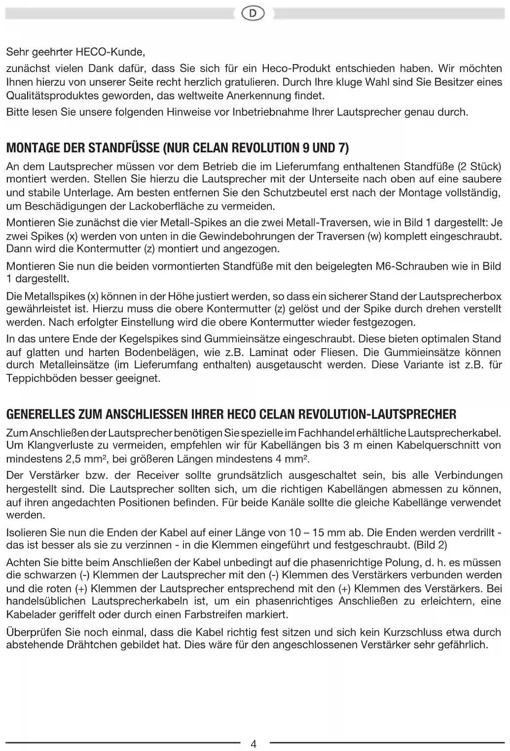 Abbildungen/Illustrations4 Sehr geehrter HECO-Kunde, zunächst vielen Dank dafür, dass Sie sich für ein Heco-Produkt entschieden haben. Wir möchten Ihnen hierzu von unserer Seite recht herzlich gratulieren. Durch Ihre kluge Wahl sind Sie Besitzer eines Qualitätsproduktes geworden, das weltweite Anerkennung ndet. Bitte lesen Sie unsere folgenden Hinweise vor Inbetriebnahme Ihrer Lautsprecher genau durch. MONTAGE DER STANDFÜSSE (NUR CELANREVOLUTION 9 UND 7) An dem Lautsprecher müssen vor dem Betrieb die im Lieferumfang enthaltenen Standfüße (2 Stück) montiert werden. Stellen Sie hierzu die Lautsprecher mit der Unterseite nach oben auf eine saubere und stabile Unterlage. Am besten entfernen Sie den Schutzbeutel erst nach der Montage vollständig, um Beschädigungen der Lackoberäche zu vermeiden. Montieren Sie zunächst die vier Metall-Spikes an die zwei Metall-Traversen, wie in Bild 1 dargestellt: Je zwei Spikes (x) werden von unten in die Gewindebohrungen der Traversen (w) komplett eingeschraubt. Dann wird die Kontermutter (z) montiert und angezogen. Montieren Sie nun die beiden vormontierten Standfüße mit den beigelegten M6-Schrauben wie in Bild 1 dargestellt. Die Metallspikes (x) können in der Höhe justiert werden, so dass ein sicherer Stand der Lautsprecherbox gewährleistet ist. Hierzu muss die obere Kontermutter (z) gelöst und der Spike durch drehen verstellt werden. Nach erfolgter Einstellung wird die obere Kontermutter wieder festgezogen. In das untere Ende der Kegelspikes sind Gummieinsätze eingeschraubt. Diese bieten optimalen Stand auf glatten und harten Bodenbelägen, wie z.B. Laminat oder Fliesen. Die Gummieinsätze können durch Metalleinsätze (im Lieferumfang enthalten) ausgetauscht werden. Diese Variante ist z.B. für Teppichböden besser geeignet.