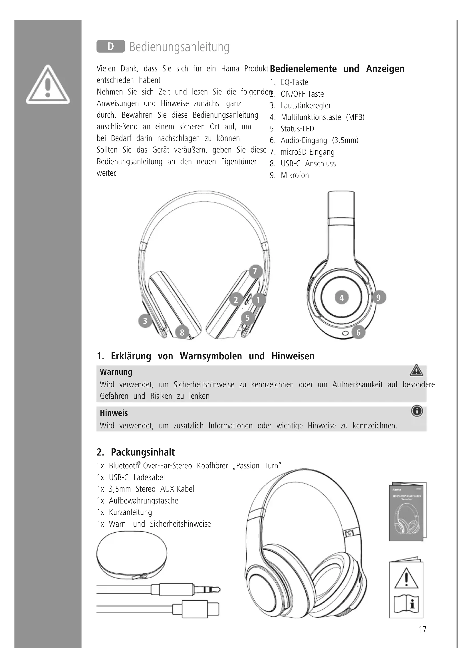 Over-Ear-Stereo Kopfhörer „Passion Turn” 1x USB-C Ladekabel 1x 3,5mm Stereo AUX-Kabel 1x Aufbewahrungstasche 1x Kurzanleitung 1x Warn- und Sicherheitshinweise
