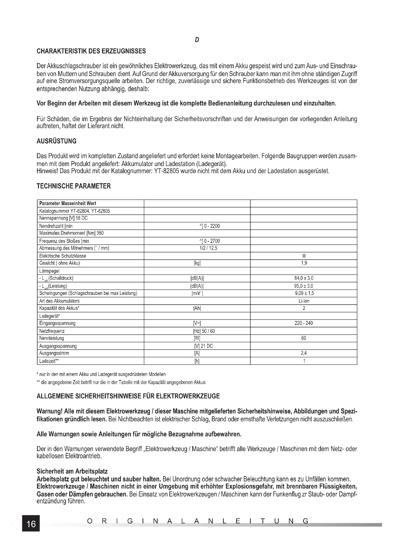 Der Akkuschlagschrauber ist ein gewöhnliches Elektrowerkzeug, das mit einem Akku gespeist wird und zum Aus- und Einschrau- ben von Muttern und Schrauben dient. Auf Grund der Akkuversorgung für den Schrauber kann man mit ihm ohne ständigen Zugriff auf eine Stromversorgungsquelle arbeiten. Der richtige, zuverlässige und sichere Funktionsbetrieb des Werkzeuges ist von der entsprechenden Nutzung abhängig, deshalb: Vor Beginn der Arbeiten mit diesem Werkzeug ist die komplette Bedienanleitung durchzulesen und einzuhalten. Für Schäden, die im Ergebnis der Nichteinhaltung der Sicherheitsvorschriften und der Anweisungen der vorliegenden Anleitung auftreten, haftet der Lieferant nicht. AUSRÜSTUNG Das Produkt wird im kompletten Zustand angeliefert und erfordert keine Montagearbeiten. Folgende Baugruppen werden zusam- men mit dem Produkt angeliefert: Akkumulator und Ladestation (Ladegerät). Hinweis! Das Produkt mit der Katalognummer: YT-82805 wurde nicht mit dem Akku und der Ladestation ausgerüstet. TECHNISCHE PARAMETER Parameter Masseinheit Wert Katalognummer YT-82804, YT-82805 Nennspannung [V] 18 DC Nendrehzahl [min