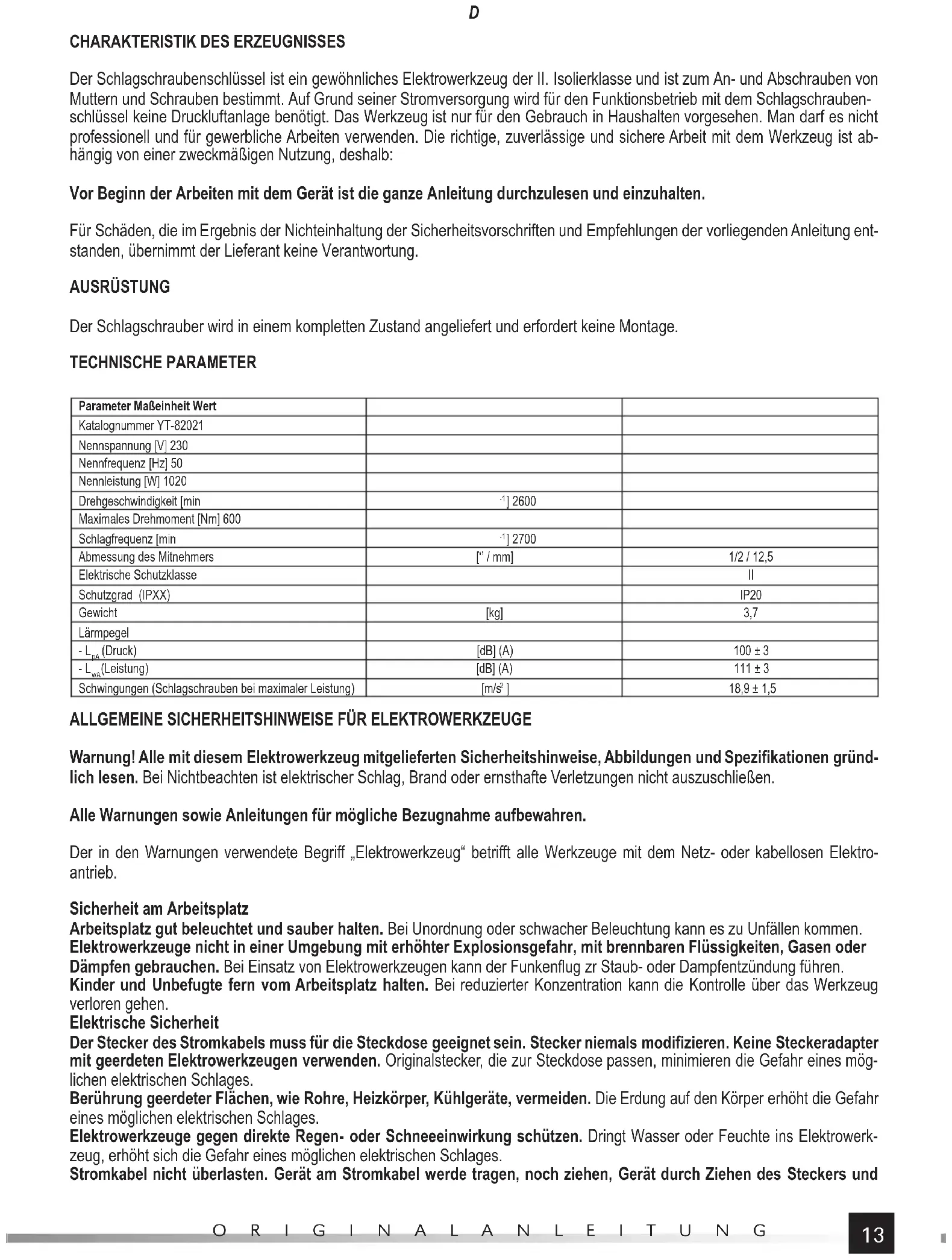 Der Schlagschraubenschlüssel ist ein gewöhnliches Elektrowerkzeug der II. Isolierklasse und ist zum An- und Abschrauben von Muttern und Schrauben bestimmt. Auf Grund seiner Stromversorgung wird für den Funktionsbetrieb mit dem Schlagschrauben- schlüssel keine Druckluftanlage benötigt. Das Werkzeug ist nur für den Gebrauch in Haushalten vorgesehen. Man darf es nicht professionell und für gewerbliche Arbeiten verwenden. Die richtige, zuverlässige und sichere Arbeit mit dem Werkzeug ist ab- hängig von einer zweckmäßigen Nutzung, deshalb: Vor Beginn der Arbeiten mit dem Gerät ist die ganze Anleitung durchzulesen und einzuhalten. Für Schäden, die im Ergebnis der Nichteinhaltung der Sicherheitsvorschriften und Empfehlungen der vorliegenden Anleitung ent- standen, übernimmt der Lieferant keine Verantwortung. AUSRÜSTUNG Der Schlagschrauber wird in einem kompletten Zustand angeliefert und erfordert keine Montage. TECHNISCHE PARAMETER Parameter Maßeinheit Wert Katalognummer YT-82021 Nennspannung [V] 230 Nennfrequenz [Hz] 50 Nennleistung [W] 1020 Drehgeschwindigkeit [min
