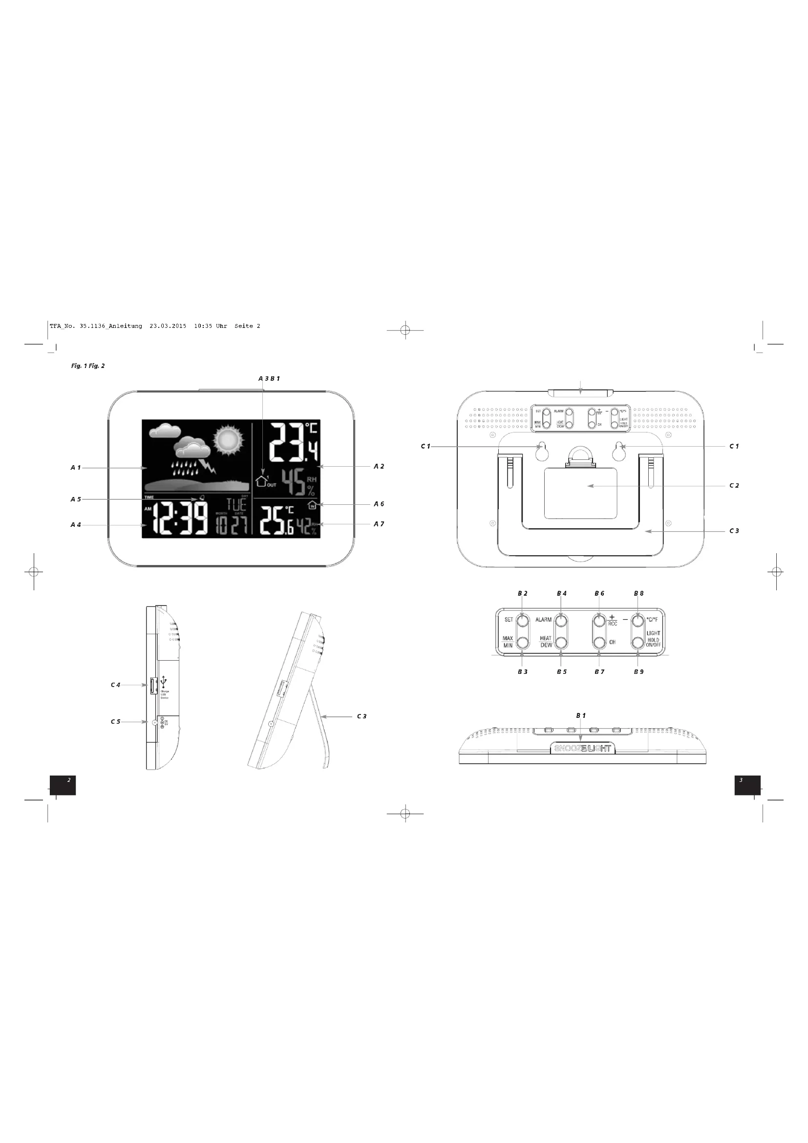 Display-Anzeige (Fig. 1) A1: Wettervorhersage mit Symbolen A2: Außentemperatur und –luftfeuchtigkeit A3: Außensendersymbol mit Kanalnummer A4: Uhrzeit, Wochentag und Datum A5: Alarmsymbol A6: Symbol für Innen A7: Innentemperatur und –luftfeuchtigkeit Tasten (Fig. 2) B1: SNOOZE/LIGHT Taste B2: SET Taste B3: MAX/MIN Taste B4: ALARM Taste B5: HEAT/DEW Taste B6: +/RCC Taste B7: CH Taste B8: -/°C/°F Taste B9: LIGHT HOLD ON/OFF Taste Gehäuse (Fig. 1+2) C1: Wandaufhängungen C2: Batteriefach C3: Ständer (ausklappbar) C4: USB Ausgang C5: Netzteilanschluss