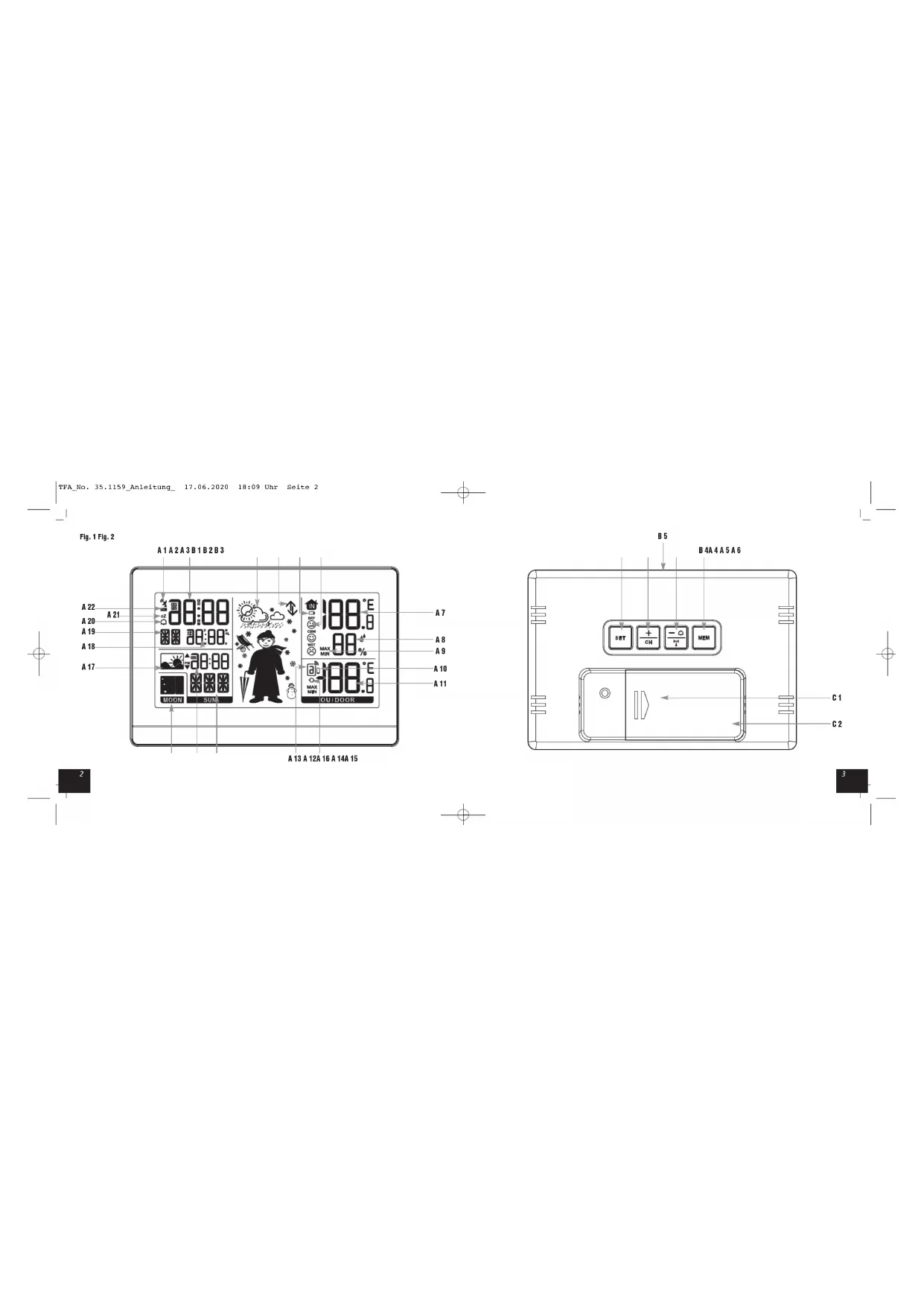 A: LCD-Anzeige (Fig. 1): A 1: DCF-Empfangssymbol A 2: Uhrzeit (DCF) A 3: Wettervorhersage mit Symbolen und „Weather Boy” A 4: Luftdrucktrend A 5: Batteriesymbol für die Basisstation A 6: Komfortstufe des Raumklimas A 7: Innentemperatur A 8: Innenluftfeuchtigkeit A 9: Höchst- und Tiefstwerte A 10: Batteriesymbol für den Außensender A 11: Außentemperatur A 12: Kanalwechsel-Symbol A 13: Kanalnummer mit Empfangssymbol A 14: Städte-Code A 15: Uhrzeit für Sonnenaufgang/Sonnenuntergang/Tageslänge A 16: Mondphase A 17: Symbol für Sonnenaufgang/Sonnenuntergang/Tageslänge A 18: Datum/Alarmzeit/Sekunden A 19: Wochentag A 20: Alarmsymbol A 21: Snooze-Symbol A 22: Sommerzeit-Symbol B: Tasten (Fig. 2): B 1: SET Taste B 2: +/CH Taste TFA_No. 35.1159_Anleitung_ 17.06.2020 18:09 Uhr Seite 498 WEATHER BOY – Funk-Wetterstation