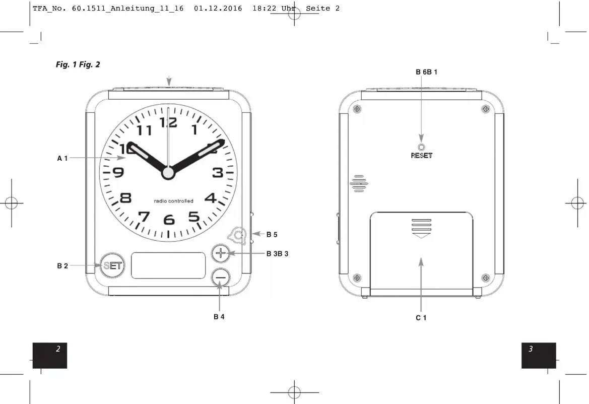 Bedienungsanleitung Instruction manual Mode d’emploi Instrucciones de uso Gebruiksaanwijzing Istruzioni per l'uso Kat. Nr. 60.1511 RoHS TFA_No. 60.1511_Anleitung_11_16 01.12.2016 18:22 Uhr Seite 132 Fig. 1 Fig. 2 A 1 B 3B 3 B 5 B 2 B 6B 1 B 4 C 1 TFA_No. 60.1511_Anleitung_11_16 01.12.2016 18:22 Uhr Seite 2Fig. 3