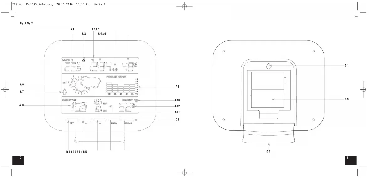 Wetterstation (Basisstation) Display-Anzeige (Fig. 1) A 1: Innentemperatur A 2: DCF Empfangssymbol A 3: Wochentag A 4: Zeit/Alarmzeit/Datum A 5: Alarmsymbol A 6: Innenluftfeuchtigkeit/Sekunden A 7: Luftdrucktendenz A 8: Wettervorhersage mit Symbolen A 9: Luftdruckverlauf der letzten 12 Stunden A 10: Außentemperatur A 11: Maximum- und Minimum-Anzeige A 12: Außenluftfeuchtigkeit A 13: Empfangssymbol für Außenwerte Tasten (Fig. 1) B 1: SET Taste B 2: + Taste B 3: – Taste B 4: ALARM Taste B 5: MIN / MAX Taste Gehäuse (Fig. 1+2) C 1: Wandaufhängung C 2: Tasten C 3: Batteriefach C 4: Ständer (abnehmbar) Sender (Fig. 3) D 1: Batteriefach D 2: Ständer zur Wandmontage oder Tischaufstellung