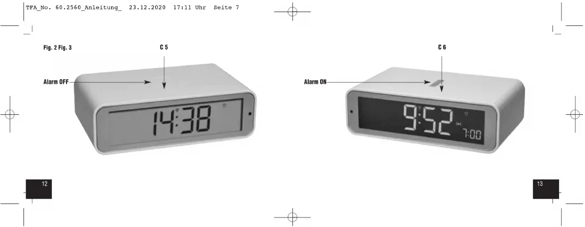 Instrucciones de uso Fig. 1 A 1 A 2 A 3 A 7A 5 A 4 A 6 D 1 TFA_No. 60.2560_Anleitung_ 23.12.2020 17:11 Uhr Seite 61312 Fig. 2 Fig. 3 Alarm ON C 6 Alarm OFF C 5 TFA_No. 60.2560_Anleitung_ 23.12.2020 17:11 Uhr Seite 715 TWIST – Funkwecker