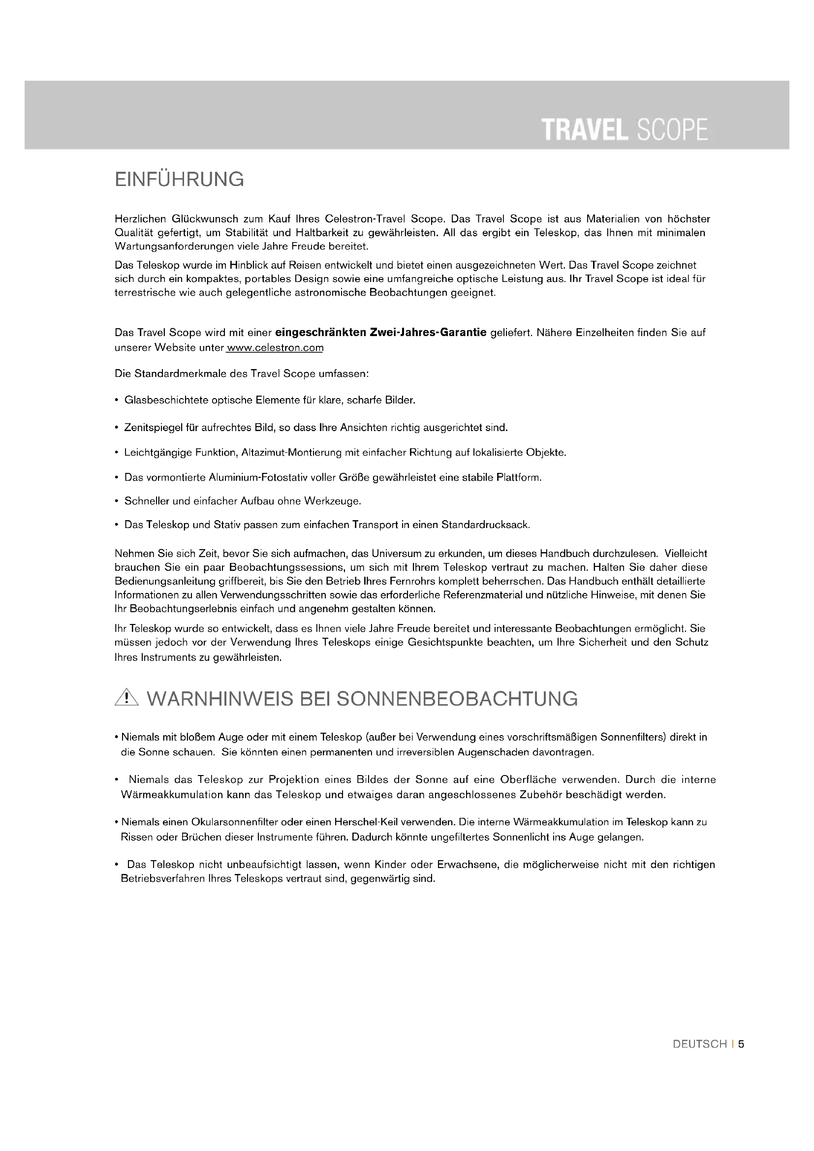 - ZWEIJÄHRIGE EINGESCHRÄNKTE GARANTIE VON CELESTRON I DEUTSCHDEUTSCH I 5 Herzlichen Glückwunsch zum Kauf Ihres Celestron-Travel Scope. Das Travel Scope ist aus Materialien von höchster Qualität gefertigt, um Stabilität und Haltbarkeit zu gewährleisten. All das ergibt ein Teleskop, das Ihnen mit minimalen Wartungsanforderungen viele Jahre Freude bereitet. Das Teleskop wurde im Hinblick auf Reisen entwickelt und bietet einen ausgezeichneten Wert. Das Travel Scope zeichnet sich durch ein kompaktes, portables Design sowie eine umfangreiche optische Leistung aus. Ihr Travel Scope ist ideal für terrestrische wie auch gelegentliche astronomische Beobachtungen geeignet. Das Travel Scope wird mit einer eingeschränkten Zwei-Jahres-Garantie geliefert. Nähere Einzelheiten finden Sie auf unserer Website unter www.celestron.com Die Standardmerkmale des Travel Scope umfassen: p. 204