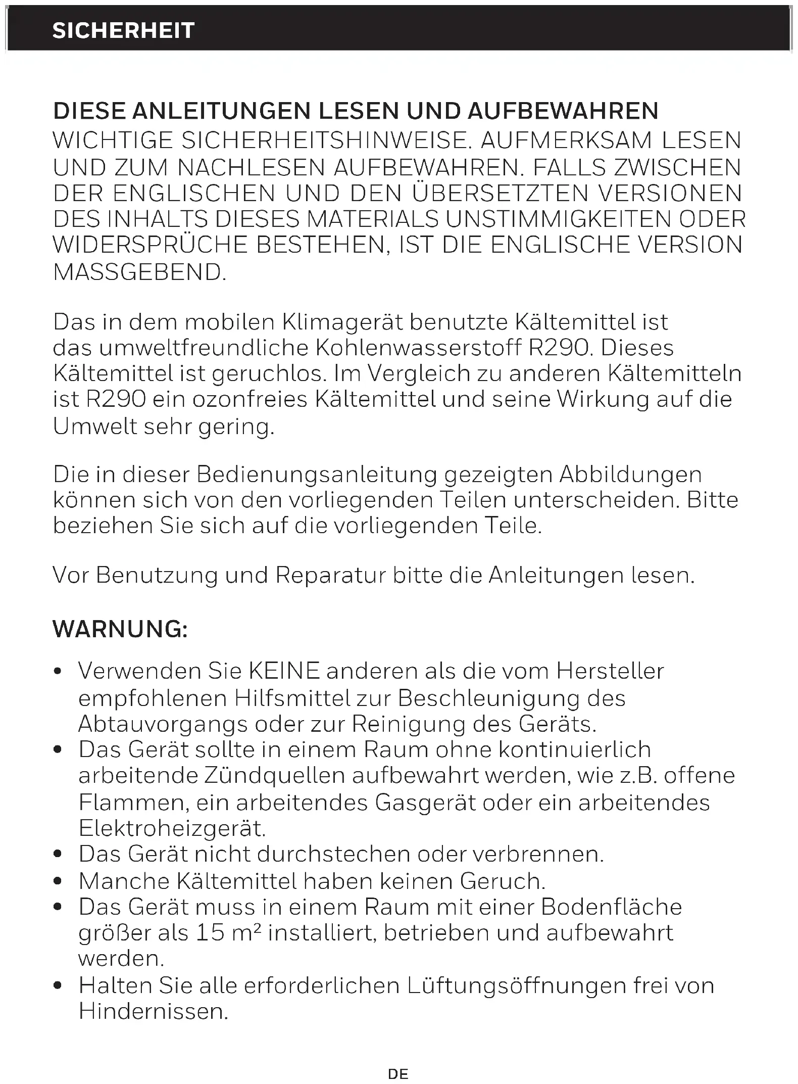 Verwenden Sie KEINE anderen als die vom Hersteller empfohlenen Hilfsmittel zur Beschleunigung des Abtauvorgangs oder zur Reinigung des Geräts. Das Gerät sollte in einem Raum ohne kontinuierlich arbeitende Zündquellen aufbewahrt werden, wie z.B. offene Flammen, ein arbeitendes Gasgerät oder ein arbeitendes Elektroheizgerät. Das Gerät nicht durchstechen oder verbrennen. Manche Kältemittel haben keinen Geruch. Das Gerät muss in einem Raum mit einer Bodenfläche größer als 15 m² installiert, betrieben und aufbewahrt werden. Halten Sie alle erforderlichen Lüftungsöffnungen frei von Hindernissen. DESICHERHEIT (FORTSETZUNG) Die Wartung muss ausschließlich auf die vom Hersteller empfohlene Weise erfolgen. Dieses Gerät muss in einem Raum aufbewahrt werden, der eine gute Luftzirkulation zwischen dem Gerät und Wänden/ Möbelstücken oder anderen Gegenständen zulässt. Die Raumgröße muss mit der vom Hersteller für den Betrieb des Gerätes angegebenen Nutzungsfläche übereinstimmen. Das Gerät muss vor mechanischen Beschädigungen geschützt werden. Alle Personen, die an der Arbeit an oder Eingriffen in den Kältemittelkreislauf beteiligt sind, müssen über ein gültiges Zertifikat von einer von der Industrie akkreditierten Prüfstelle verfügen, damit ihre fachliche Kompetenz in Bezug auf den sicheren Umgang mit Kältemitteln gemäß Branchenstandards sichergestellt ist. Es dürfen nur Personen mit einer Zulassung von einer akkreditierten Behörde, die deren Kompetenz im Umgang mit Kältemittel unter Einhaltung der Branchengesetze bestätigt, an dem Kältemittelkreislauf arbeiten. Wartungsarbeiten und Reparaturen, die die Hilfe anderer Fachkräfte erfordern, müssen unter Aufsicht von Fachleuten im Umgang mit brennbaren Kältemitteln durchgeführt werden. Alle Arbeitsvorgänge, die Sicherheitsvorrichtungen betreffen, dürfen nur von Fachleuten durchgeführt werden. Dieses Gerät darf nicht von Kindern und Personen mit eingeschränkten körperlichen, sensorischen oder geistigen Fähigkeiten oder Personen, denen es Erfahrung und Kenntnis mangelt, benutzt werden; es sei denn, sie werden beaufsichtigt oder in die sichere Benutzung des Gerätes unterwiesen und verstehen die damit verbundenen Gefahren. Kinder dürfen nicht mit dem Gerät spielen. Die Reinigung und vom Benutzer auszuführende Wartungsarbeiten dürfen von Kindern nur unter Aufsicht durchgeführt werden.