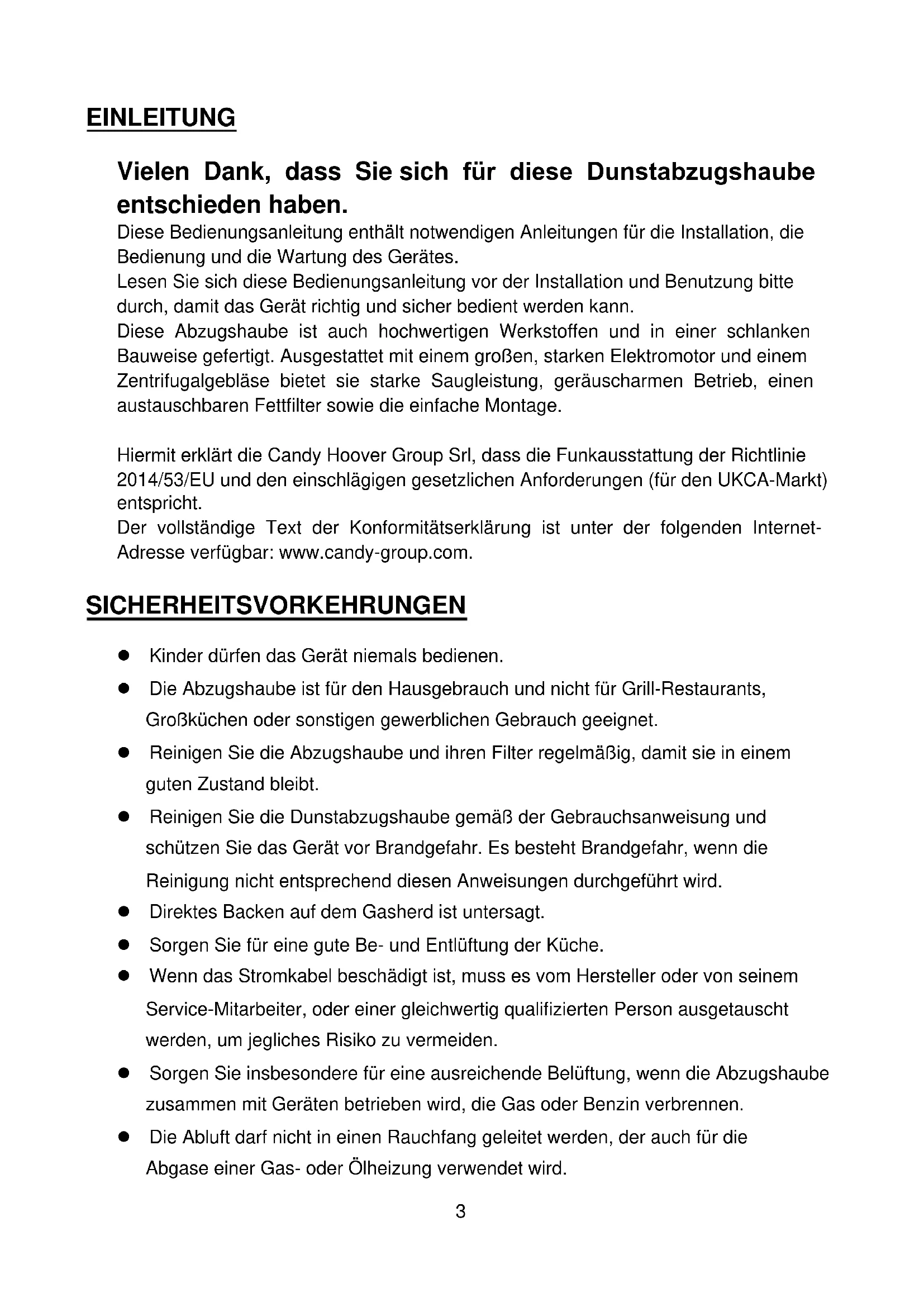 - UMWELTSCHUTZ EINLEITUNG Vielen Dank, dass Sie sich für diese Dunstabzugshaube entschieden haben. Diese Bedienungsanleitung enthält notwendigen Anleitungen für die Installation, die Bedienung und die Wartung des Gerätes. Lesen Sie sich diese Bedienungsanleitung vor der Installation und Benutzung bitte durch, damit das Gerät richtig und sicher bedient werden kann. Diese Abzugshaube ist auch hochwertigen Werkstoffen und in einer schlanken Bauweise gefertigt. Ausgestattet mit einem großen, starken Elektromotor und einem Zentrifugalgebläse bietet sie starke Saugleistung, geräuscharmen Betrieb, einen austauschbaren Fettfilter sowie die einfache Montage. Hiermit erklärt die Candy Hoover Group Srl, dass die Funkausstattung der Richtlinie 2014/53/EU und den einschlägigen gesetzlichen Anforderungen (für den UKCA-Markt) entspricht. Der vollständige Text der Konformitätserklärung ist unter der folgenden Internet- Adresse verfügbar: www.candy-group.com. SICHERHEITSVORKEHRUNGEN ⚫ Kinder dürfen das Gerät niemals bedienen. ⚫ Die Abzugshaube ist für den Hausgebrauch und nicht für Grill-Restaurants, Großküchen oder sonstigen gewerblichen Gebrauch geeignet. ⚫ Reinigen Sie die Abzugshaube und ihren Filter regelmäßig, damit sie in einem guten Zustand bleibt. ⚫ Reinigen Sie die Dunstabzugshaube gemäß der Gebrauchsanweisung und schützen Sie das Gerät vor Brandgefahr. Es besteht Brandgefahr, wenn die Reinigung nicht entsprechend diesen Anweisungen durchgeführt wird. ⚫ Direktes Backen auf dem Gasherd ist untersagt. ⚫ Sorgen Sie für eine gute Be- und Entlüftung der Küche. ⚫ Wenn das Stromkabel beschädigt ist, muss es vom Hersteller oder von seinem Service-Mitarbeiter, oder einer gleichwertig qualifizierten Person ausgetauscht werden, um jegliches Risiko zu vermeiden. ⚫ Sorgen Sie insbesondere für eine ausreichende Belüftung, wenn die Abzugshaube zusammen mit Geräten betrieben wird, die Gas oder Benzin verbrennen. ⚫ Die Abluft darf nicht in einen Rauchfang geleitet werden, der auch für die Abgase einer Gas- oder Ölheizung verwendet wird.4 ⚫ Halten Sie die vor Ort geltenden Abluftvorschriften ein. ⚫ Dieses Gerät kann von Kindern ab 8 Jahren und Personen mit eingeschränkten körperlichen, sensorischen oder geistigen Fähigkeiten oder mangelnder Erfahrung und mangelndem Wissen benutzt werden, wenn diese in die sichere Bedienung des Geräts eingewiesen wurden oder beaufsichtigt werden und die damit verbundenen Gefahren verstanden haben. ⚫ Kinder sollten beaufsichtigt werden, um sicherzustellen, dass sie nicht mit dem Gerät spielen. ⚫ Kinder dürfen das Gerät nur unter Aufsicht reinigen und pflegen. ⚫ Flambieren Sie keine Gerichte unter der Abzugshaube. ⚫ VORSICHT: Es kann sein, dass bestimmte Teile der Abzugshaube beim Kochen ⚫ heiß werden. ⚫ Der Warnhinweis muss sich in demselben Teil der Anleitung befinden, in dem auch die Montage des Geräts beschrieben wird. Gefahr von Stromschlägen ⚫ Dieses Gerät nur mit einer richtig geerdeten Steckdose verbinden. Wenden Sie sich im Zweifel an einen Fachelektriker. ⚫ Die Nichtbeachtung dieser Anweisungen kann zum Tod, Brand oder Stromschlag führen. Die in diesem Produkt verwendete Lampe ist nicht für die Beleuchtung eines Raumes geeignet. Diese Lampe dient der Beleuchtung für die Benutzung des Produkts.5 Vorbereitung der Montage: a. Wenn eine Maueröffnung nach draußen vorhanden ist, kann die Abzugshaube wie unten gezeigt über einen Abluftkanal (Emaille, Aluminium, flexibles Rohr aus unbrennbarem Material mit einem Innendurchmesser von 150 mm) an diese angeschlossen werden b. Schalten Sie vor der Installation das Gerät aus und ziehen Sie den Netzstecker. c. Die Abzugshaube sollte für eine optimale Leistung 60~75 cm über der Kochfläche aufgehängt werden. 75 cm 60 cm6 Technische Daten Modell Produktabmessungen (B,T,H, in mm) p. 143