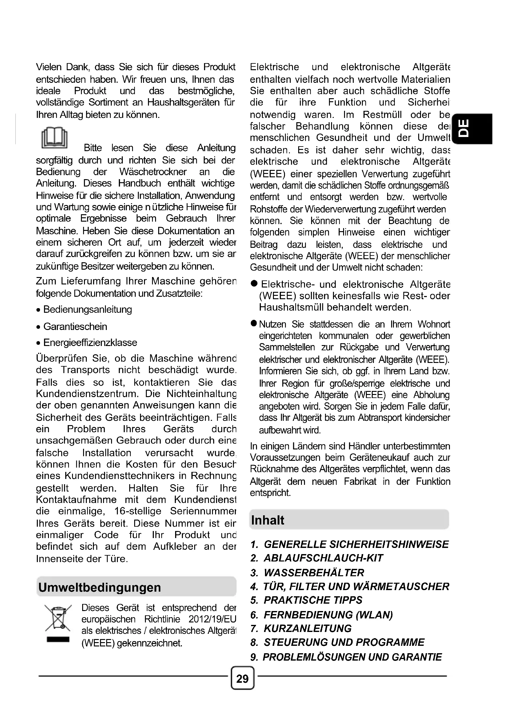sorgfältig durch und richten Sie sich bei der Bedienung der Wäschetrockner an die Anleitung. Dieses Handbuch enthalt wichtige Hinweise für die sichere Installation, Anwendung und Wartung sowie einige nützliche Hinweise für optimale Ergebnisse beim Gebrauch ihrer Maschine. Hebben Sie diese Dokumentation an einem sicheren Ort auf, um jederzeit wieder darauf auf zurückgreifen zu konnen bzw. um sie ar zusünftige Besitzer weitergeben zu konnen.