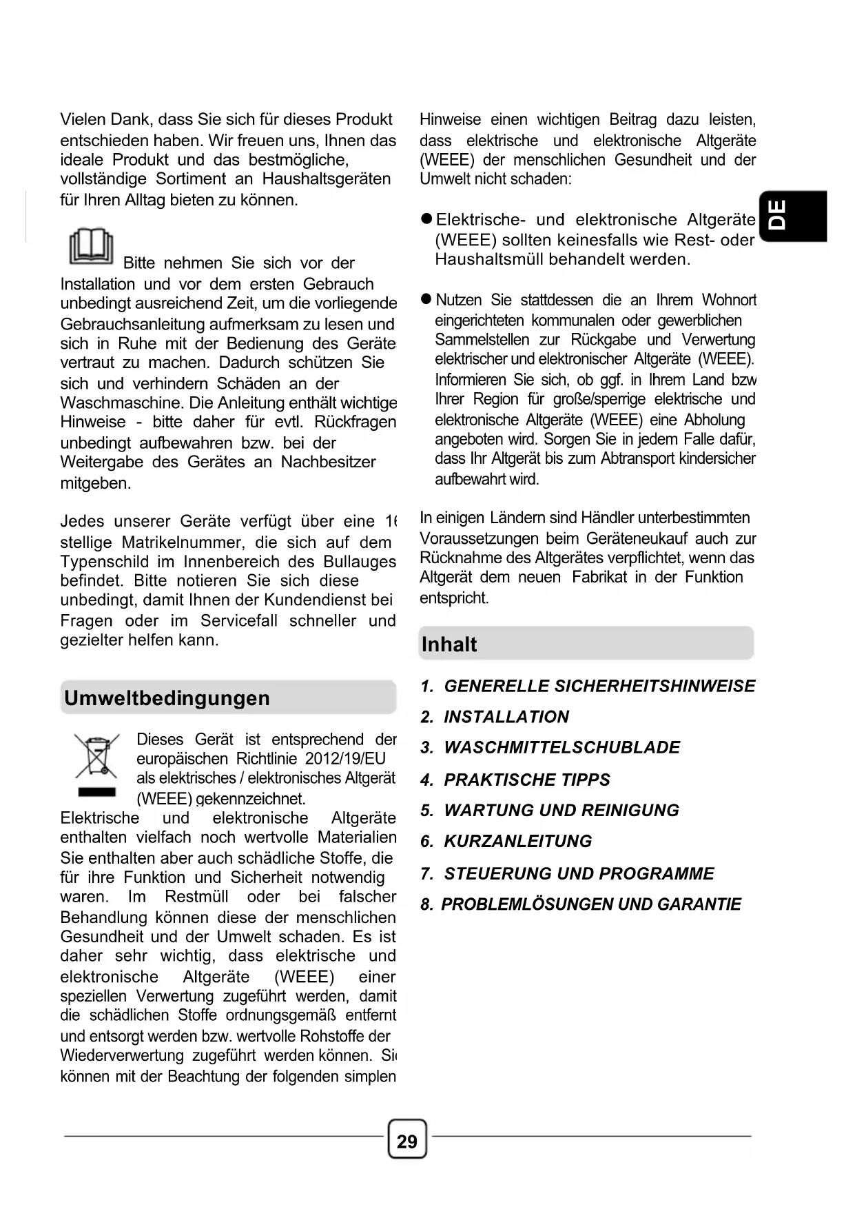 Vielen Dank, dass Sie sich für dieses Produkt entschieden haben. Wir freuen uns, Ihnen das ideale Produkt und das bestmögliche, vollständige Sortiment an Haushaltsgeräten für Ihren Alltag bieten zu können. Bitte nehmen Sie sich vor der Installation und vor dem ersten Gebrauch unbedingt ausreichend Zeit, um die vorliegende Gebrauchsanleitung aufmerksam zu lesen und sich in Ruhe mit der Bedienung des Gerätes vertraut zu machen. Dadurch schützen Sie sich und verhindern Schäden an der Waschmaschine. Die Anleitung enthält wichtige Hinweise - bitte daher für evtl. Rückfragen unbedingt aufbewahren bzw. bei der Weitergabe des Gerätes an Nachbesitzer mitgeben. Jedes unserer Geräte verfügt über eine 16- stellige Matrikelnummer, die sich auf dem Typenschild im Innenbereich des Bullauges befindet. Bitte notieren Sie sich diese unbedingt, damit Ihnen der Kundendienst bei Fragen oder im Servicefall schneller und gezielter helfen kann.