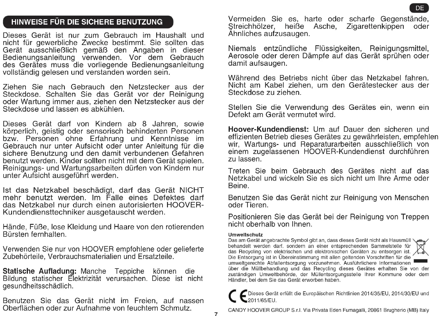Dieses Gerät ist nur zum Gebrauch im Haushalt und nicht für gewerbliche Zwecke bestimmt. Sie sollten das Gerät ausschließlich gemäß den Angaben in dieser Bedienungsanleitung verwenden. Vor dem Gebrauch des Gerätes muss die vorliegende Bedienungsanleitung vollständig gelesen und verstanden worden sein. Ziehen Sie nach Gebrauch den Netzstecker aus der Steckdose. Schalten Sie das Gerät vor der Reinigung oder Wartung immer aus, ziehen den Netzstecker aus der Steckdose und lassen es abkühlen. Dieses Gerät darf von Kindern ab 8 Jahren, sowie körperlich, geistig oder sensorisch behinderten Personen bzw. Personen ohne Erfahrung und Kenntnisse im Gebrauch nur unter Aufsicht oder unter Anleitung für die sichere Benutzung und den damit verbundenen Gefahren benutzt werden. Kinder sollten nicht mit dem Gerät spielen. Reinigungs- und Wartungsarbeiten dürfen von Kindern nur unter Aufsicht ausgeführt werden. Ist das Netzkabel beschädigt, darf das Gerät NICHT mehr benutzt werden. Im Falle eines Defektes darf das Netzkabel nur durch einen autorisierten HOOVER- Kundendiensttechniker ausgetauscht werden. Hände, Füße, lose Kleidung und Haare von den rotierenden Bürsten fernhalten. Verwenden Sie nur von HOOVER empfohlene oder gelieferte Zubehörteile, Verbrauchsmaterialien und Ersatzteile. Statische Auadung: Manche Teppiche können die Bildung statischer Elektrizität verursachen. Diese ist nicht gesundheitsschädlich. Benutzen Sie das Gerät nicht im Freien, auf nassen Oberächen oder zur Aufnahme von feuchtem Schmutz. Vermeiden Sie es, harte oder scharfe Gegenstände, Streichhölzer, heiße Asche, Zigarettenkippen oder Ähnliches aufzusaugen. Niemals entzündliche Flüssigkeiten, Reinigungsmittel, Aerosole oder deren Dämpfe auf das Gerät sprühen oder damit aufsaugen. Während des Betriebs nicht über das Netzkabel fahren. Nicht am Kabel ziehen, um den Gerätestecker aus der Steckdose zu ziehen. Stellen Sie die Verwendung des Gerätes ein, wenn ein Defekt am Gerät vermutet wird. Hoover-Kundendienst: Um auf Dauer den sicheren und efzienten Betrieb dieses Gerätes zu gewährleisten, empfehlen wir, Wartungs- und Reparaturarbeiten ausschließlich von einem zugelassenen HOOVER-Kundendienst durchführen zu lassen. Treten Sie beim Gebrauch des Gerätes nicht auf das Netzkabel und wickeln Sie es sich nicht um Ihre Arme oder Beine. Benutzen Sie das Gerät nicht zur Reinigung von Menschen oder Tieren. Positionieren Sie das Gerät bei der Reinigung von Treppen nicht oberhalb von Ihnen. Umweltschutz Das am Gerät angebrachte Symbol gibt an, dass dieses Gerät nicht als Hausmüll behandelt werden darf. sondern an einer entsprechenden Sammelstelle für das Recycling von elektrischen und elektronischen Geräten zu entsorgen ist. Die Entsorgung ist in Übereinstimmung mit allen geltenden Vorschriften für die umweltgerechte Abfallentsorgung vorzunehmen. Ausführlichere Informationen über die Müllbehandlung und das Recycling dieses Gerätes erhalten Sie von der zuständigen Umweltbehörde, der Müllentsorgungsstelle Ihrer Kommune oder dem Händler, bei dem Sie das Gerät erworben haben. Dieses Gerät erfüllt die Europäischen Richtlinien 2014/35/EU, 2014/30/EU und 2011/65/EU. CANDY HOOVER GROUP S.r.l. Via Privata Eden Fumagalli, 20861 Brugherio (MB) Italy DE8 *Geräteausstattung ist modellabhängig **Die Ausführung der Düse kann je nach Modell unterschiedlich ausfallen GERÄTEBESCHREIBUNG