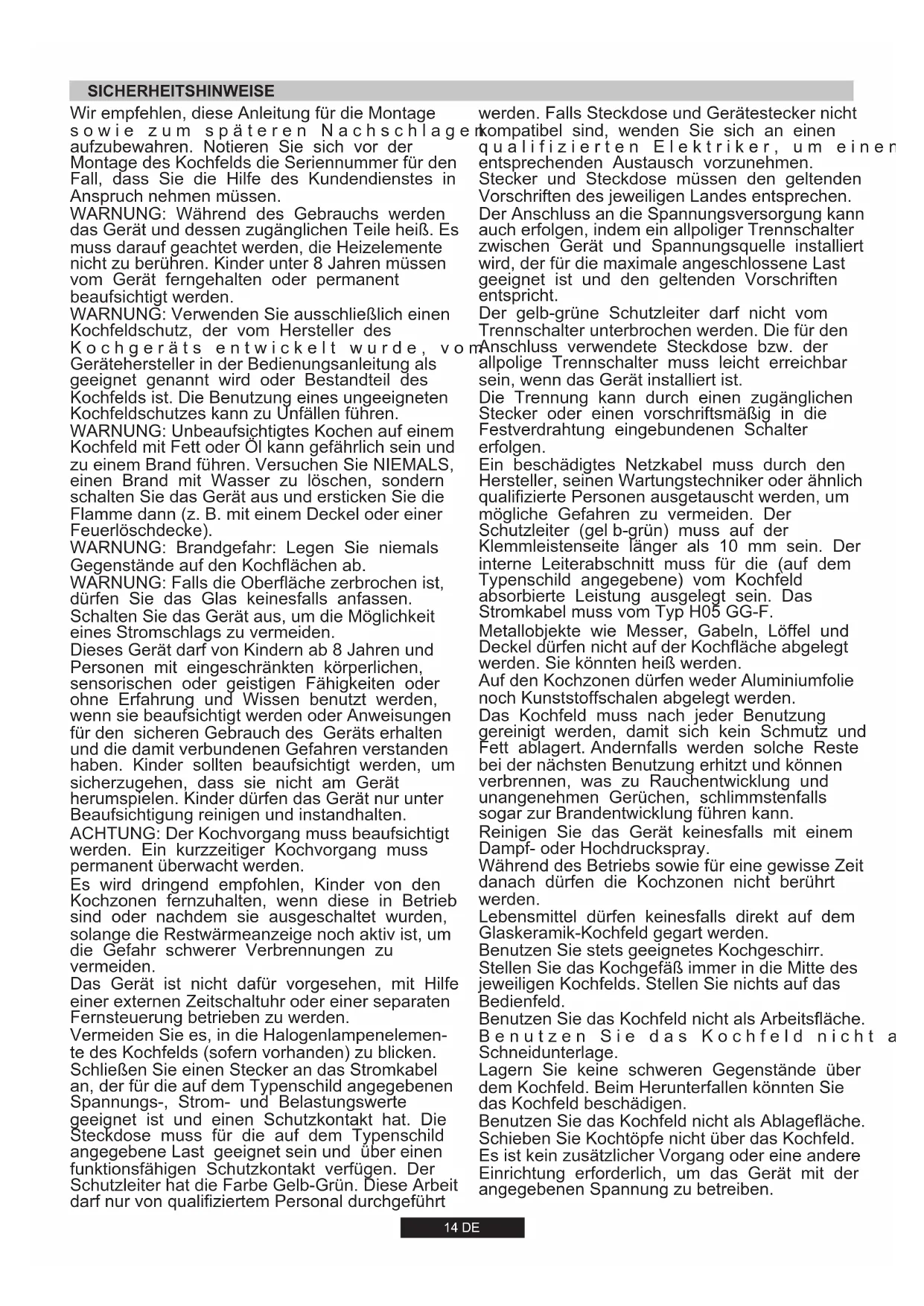 - není problém v přípojce plynu. Pokud nelze závadu odstranit: vypněte spotřebič, nedemontujte jej a kontaktujte autorizované servisní středisko.14 DE Wir empfehlen, diese Anleitung für die Montage s o w i e z u m s p ä t e r e n N a c h s c h l a g e n aufzubewahren. Notieren Sie sich vor der Montage des Kochfelds die Seriennummer für den Fall, dass Sie die Hilfe des Kundendienstes in Anspruch nehmen müssen. WARNUNG: Während des Gebrauchs werden das Gerät und dessen zugänglichen Teile heiß. Es muss darauf geachtet werden, die Heizelemente nicht zu berühren. Kinder unter 8 Jahren müssen vom Gerät ferngehalten oder permanent beaufsichtigt werden. WARNUNG: Verwenden Sie ausschließlich einen Kochfeldschutz, der vom Hersteller des K o c h g e r ä t s e n t w i c k e l t w u r d e , v o m Gerätehersteller in der Bedienungsanleitung als geeignet genannt wird oder Bestandteil des Kochfelds ist. Die Benutzung eines ungeeigneten Kochfeldschutzes kann zu Unfällen führen. WARNUNG: Unbeaufsichtigtes Kochen auf einem Kochfeld mit Fett oder Öl kann gefährlich sein und zu einem Brand führen. Versuchen Sie NIEMALS, einen Brand mit Wasser zu löschen, sondern schalten Sie das Gerät aus und ersticken Sie die Flamme dann (z. B. mit einem Deckel oder einer Feuerlöschdecke). WARNUNG: Brandgefahr: Legen Sie niemals Gegenstände auf den Kochflächen ab. WARNUNG: Falls die Oberfläche zerbrochen ist, dürfen Sie das Glas keinesfalls anfassen. Schalten Sie das Gerät aus, um die Möglichkeit eines Stromschlags zu vermeiden. Dieses Gerät darf von Kindern ab 8 Jahren und Personen mit eingeschränkten körperlichen, sensorischen oder geistigen Fähigkeiten oder ohne Erfahrung und Wissen benutzt werden, wenn sie beaufsichtigt werden oder Anweisungen für den sicheren Gebrauch des Geräts erhalten und die damit verbundenen Gefahren verstanden haben. Kinder sollten beaufsichtigt werden, um sicherzugehen, dass sie nicht am Gerät herumspielen. Kinder dürfen das Gerät nur unter Beaufsichtigung reinigen und instandhalten. ACHTUNG: Der Kochvorgang muss beaufsichtigt werden. Ein kurzzeitiger Kochvorgang muss permanent überwacht werden. Es wird dringend empfohlen, Kinder von den Kochzonen fernzuhalten, wenn diese in Betrieb sind oder nachdem sie ausgeschaltet wurden, solange die Restwärmeanzeige noch aktiv ist, um die Gefahr schwerer Verbrennungen zu vermeiden. Das Gerät ist nicht dafür vorgesehen, mit Hilfe einer externen Zeitschaltuhr oder einer separaten Fernsteuerung betrieben zu werden. Vermeiden Sie es, in die Halogenlampenelemen- te des Kochfelds (sofern vorhanden) zu blicken. Schließen Sie einen Stecker an das Stromkabel an, der für die auf dem Typenschild angegebenen Spannungs-, Strom- und Belastungswerte geeignet ist und einen Schutzkontakt hat. Die Steckdose muss für die auf dem Typenschild angegebene Last geeignet sein und über einen funktionsfähigen Schutzkontakt verfügen. Der Schutzleiter hat die Farbe Gelb-Grün. Diese Arbeit darf nur von qualifiziertem Personal durchgeführt SICHERHEITSHINWEISE werden. Falls Steckdose und Gerätestecker nicht kompatibel sind, wenden Sie sich an einen q u a l i f i z i e r t e n E l e k t r i k e r , u m e i n e n entsprechenden Austausch vorzunehmen. Stecker und Steckdose müssen den geltenden Vorschriften des jeweiligen Landes entsprechen. Der Anschluss an die Spannungsversorgung kann auch erfolgen, indem ein allpoliger Trennschalter zwischen Gerät und Spannungsquelle installiert wird, der für die maximale angeschlossene Last geeignet ist und den geltenden Vorschriften entspricht. Der gelb-grüne Schutzleiter darf nicht vom Trennschalter unterbrochen werden. Die für den Anschluss verwendete Steckdose bzw. der allpolige Trennschalter muss leicht erreichbar sein, wenn das Gerät installiert ist. Die Trennung kann durch einen zugänglichen Stecker oder einen vorschriftsmäßig in die Festverdrahtung eingebundenen Schalter erfolgen. Ein beschädigtes Netzkabel muss durch den Hersteller, seinen Wartungstechniker oder ähnlich qualifizierte Personen ausgetauscht werden, um mögliche Gefahren zu vermeiden. Der Schutzleiter (gel b-grün) muss auf der Klemmleistenseite länger als 10 mm sein. Der interne Leiterabschnitt muss für die (auf dem Typenschild angegebene) vom Kochfeld absorbierte Leistung ausgelegt sein. Das Stromkabel muss vom Typ H05 GG-F. Metallobjekte wie Messer, Gabeln, Löffel und Deckel dürfen nicht auf der Kochfläche abgelegt werden. Sie könnten heiß werden. Auf den Kochzonen dürfen weder Aluminiumfolie noch Kunststoffschalen abgelegt werden. Das Kochfeld muss nach jeder Benutzung gereinigt werden, damit sich kein Schmutz und Fett ablagert. Andernfalls werden solche Reste bei der nächsten Benutzung erhitzt und können verbrennen, was zu Rauchentwicklung und unangenehmen Gerüchen, schlimmstenfalls sogar zur Brandentwicklung führen kann. Reinigen Sie das Gerät keinesfalls mit einem Dampf- oder Hochdruckspray. Während des Betriebs sowie für eine gewisse Zeit danach dürfen die Kochzonen nicht berührt werden. Lebensmittel dürfen keinesfalls direkt auf dem Glaskeramik-Kochfeld gegart werden. Benutzen Sie stets geeignetes Kochgeschirr. Stellen Sie das Kochgefäß immer in die Mitte des jeweiligen Kochfelds. Stellen Sie nichts auf das Bedienfeld. Benutzen Sie das Kochfeld nicht als Arbeitsfläche. B e n u t z e n S i e d a s K o c h f e l d n i c h t a l s Schneidunterlage. Lagern Sie keine schweren Gegenstände über dem Kochfeld. Beim Herunterfallen könnten Sie das Kochfeld beschädigen. Benutzen Sie das Kochfeld nicht als Ablagefläche. Schieben Sie Kochtöpfe nicht über das Kochfeld. Es ist kein zusätzlicher Vorgang oder eine andere Einrichtung erforderlich, um das Gerät mit der angegebenen Spannung zu betreiben.15 DE Die Arbeitsplatte, in der diese Kochmulde eingebaut werden soll, kann aus beliebigem Material sein, vorausgesetzt, es ist hitzebeständig und kann eine Temperatur von 100°C aushalten. Die