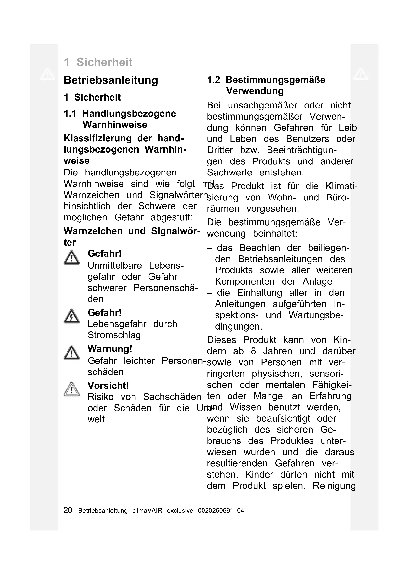 Wifi-funktion............................................ 141 Sicherheit 20 Betriebsanleitung climaVAIR exclusive 0020250591_04 Betriebsanleitung 1 Sicherheit
