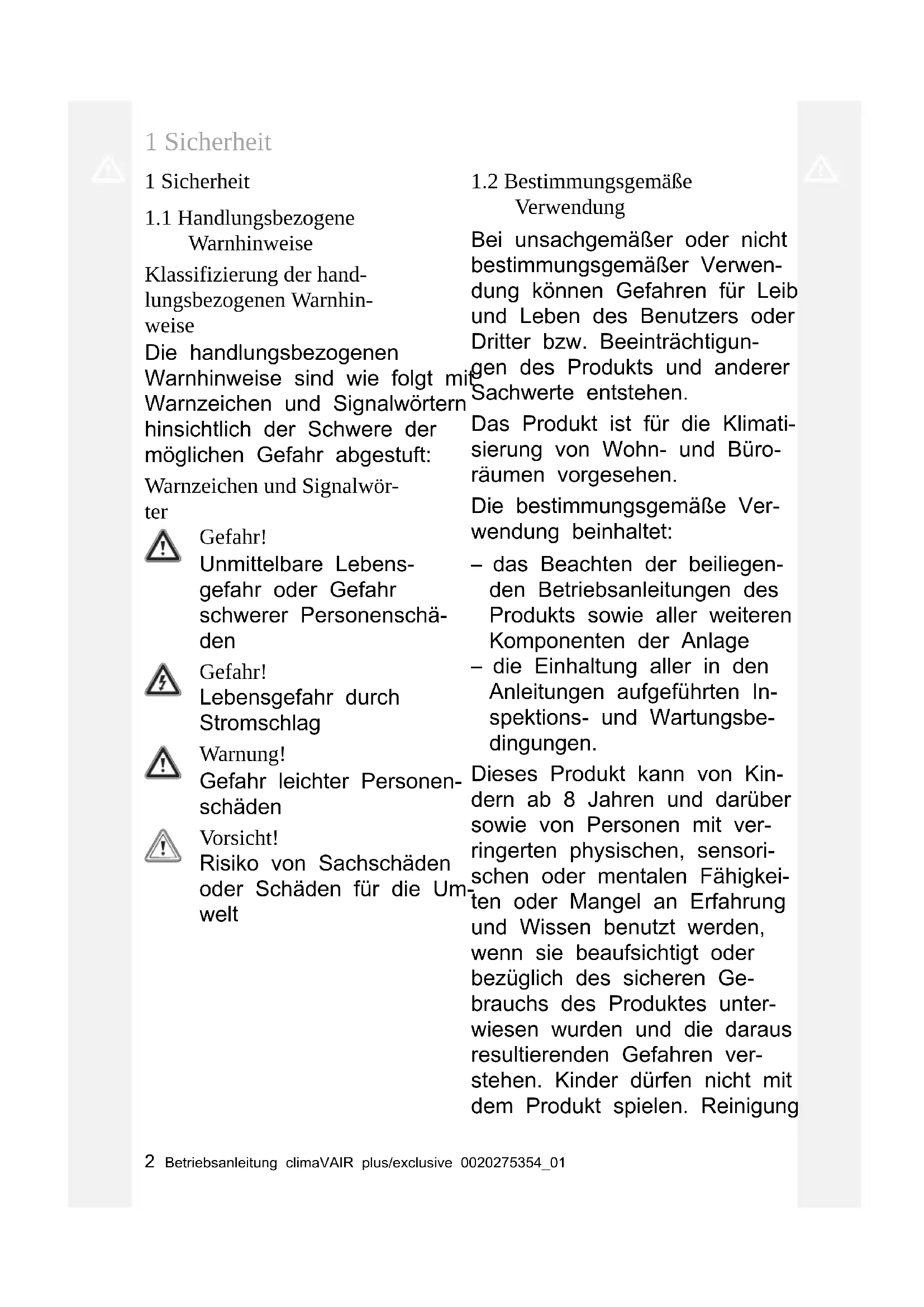 Fehlbedienung Durch Fehlbedienung können Sie sich selbst und andere ge- fährden und Sachschäden ver- ursachen. ▶ Lesen Sie die vorliegende An- leitung und alle mitgeltenden Unterlagen sorgfältig durch, insb. das Kapitel "Sicherheit" und die Warnhinweise. ▶ Führen Sie nur diejenigen Tä- tigkeiten durch, zu denen die vorliegende Betriebsanleitung anleitet.1 Sicherheit 4 Betriebsanleitung climaVAIR plus/exclusive 0020275354_01