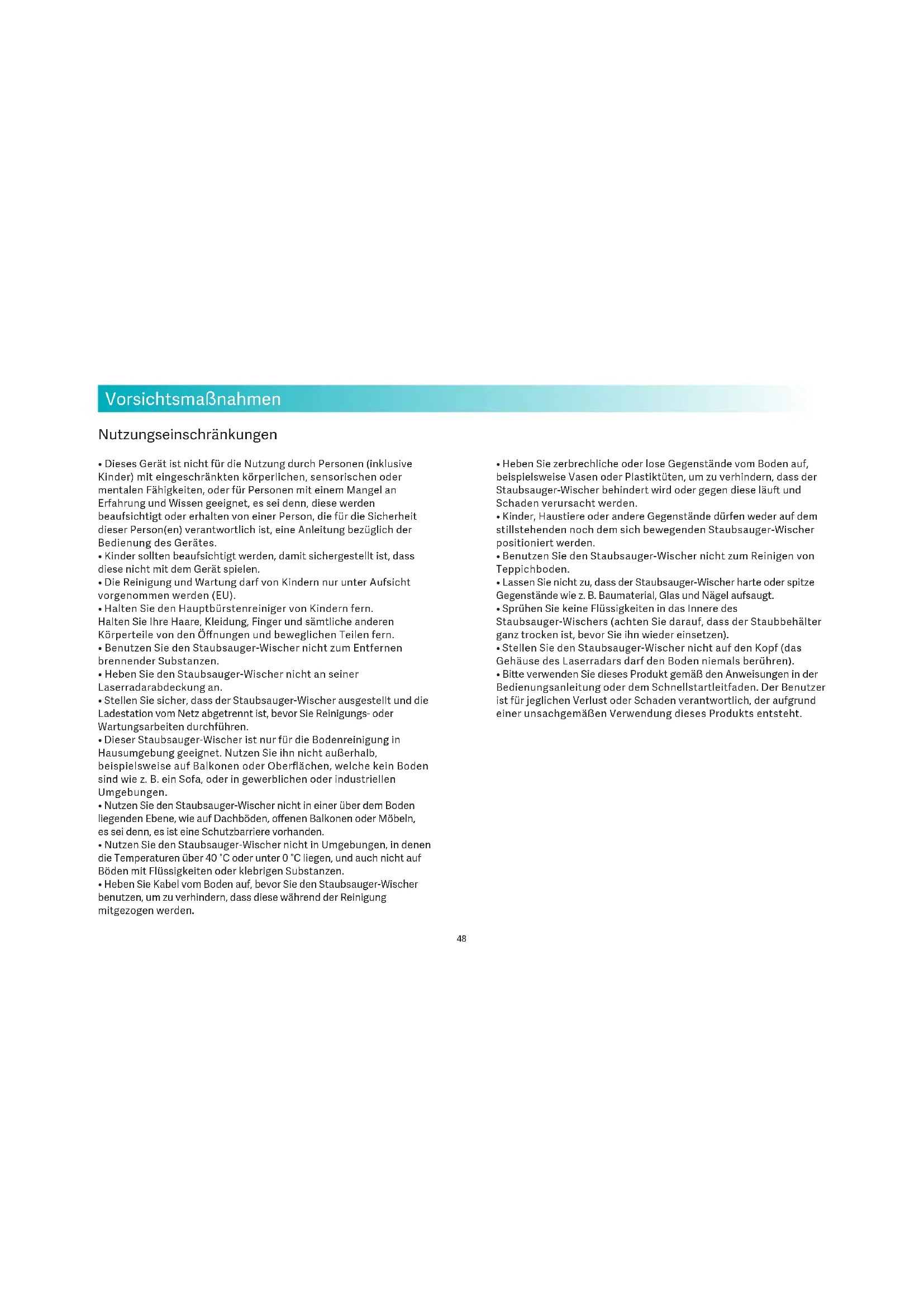 - Dieser Staubsauger-Wischer ist nur für die Bodenreinigung in Hausumgebung geeignet. Nutzen Sie ihn nicht außerhalb, beispielsweise auf Balkonen oder Oberflächen, welche kein Boden sind wie z.B. ein Sofa, oder in gewerblichen oder industriellen Umgebungen.