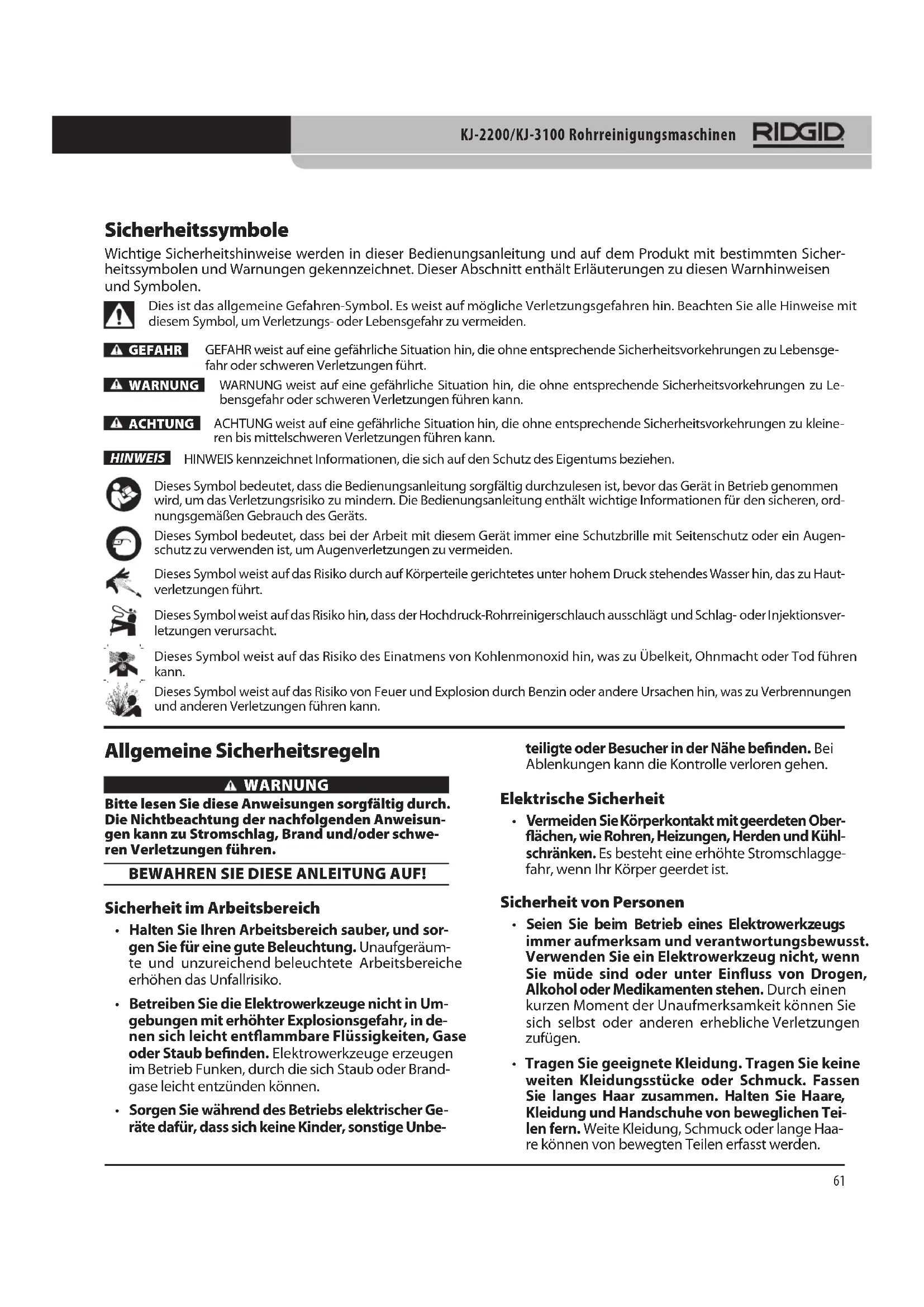 Sicherheitssymbole Wichtige Sicherheitshinweise werden in dieser Bedienungsanleitung und auf dem Produkt mit bestimmten Sicher- heitssymbolen und Warnungen gekennzeichnet. Dieser Abschnitt enthält Erläuterungen zu diesen Warnhinweisen und Symbolen.Dies ist das allgemeine Gefahren-Symbol. Es weist auf mögliche Verletzungsgefahren hin. Beachten Sie alle Hinweise mit diesem Symbol, um Verletzungs- oder Lebensgefahr zu vermeiden. GEFAHR WARNUNG ACHTUNGHINWEIS GEFAHR weist auf eine gefährliche Situation hin, die ohne entsprechende Sicherheitsvorkehrungen zu Lebensge- fahr oder schweren Verletzungen führt. WARNUNG weist auf eine gefährliche Situation hin, die ohne entsprechende Sicherheitsvorkehrungen zu Le- bensgefahr oder schweren Verletzungen führen kann. ACHTUNG weist auf eine gefährliche Situation hin, die ohne entsprechende Sicherheitsvorkehrungen zu kleine- ren bis mittelschweren Verletzungen führen kann.HINWEIS kennzeichnet Informationen, die sich auf den Schutz des Eigentums beziehen.Dieses Symbol bedeutet, dass die Bedienungsanleitung sorgfältig durchzulesen ist, bevor das Gerät in Betrieb genommen wird, um das Verletzungsrisiko zu mindern. Die Bedienungsanleitung enthält wichtige Informationen für den sicheren, ord- nungsgemäßen Gebrauch des Geräts. Dieses Symbol bedeutet, dass bei der Arbeit mit diesem Gerät immer eine Schutzbrille mit Seitenschutz oder ein Augen- schutz zu verwenden ist, um Augenverletzungen zu vermeiden. Dieses Symbol weist auf das Risiko durch auf Körperteile gerichtetes unter hohem Druck stehendes Wasser hin, das zu Haut- verletzungen führt. Dieses Symbol weist auf das Risiko hin, dass der Hochdruck-Rohrreinigerschlauch ausschlägt und Schlag- oder Injektionsver- letzungen verursacht.Dieses Symbol weist auf das Risiko des Einatmens von Kohlenmonoxid hin, was zu Übelkeit, Ohnmacht oder Tod führen kann.Dieses Symbol weist auf das Risiko von Feuer und Explosion durch Benzin oder andere Ursachen hin, was zu Verbrennungen und anderen Verletzungen führen kann. Allgemeine Sicherheitsregeln WARNUNG Bitte lesen Sie diese Anweisungen sorgfältig durch. Die Nichtbeachtung der nachfolgenden Anweisun-gen kann zu Stromschlag, Brand und/oder schwe-ren Verletzungen führen. BEWAHREN SIE DIESE ANLEITUNG AUF! Sicherheit im Arbeitsbereich