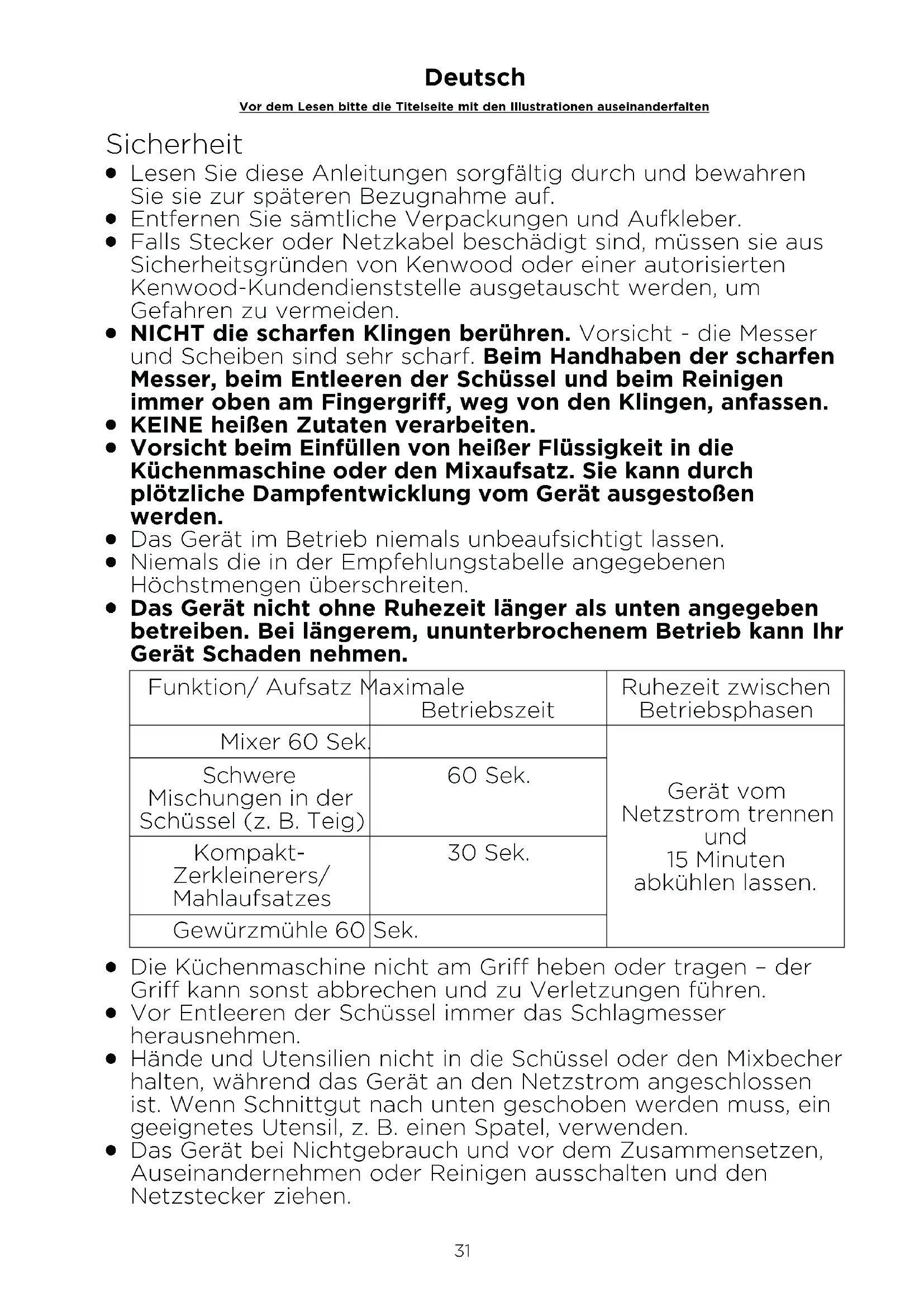 Das Gerät nicht ohne Ruhezeit länger als unten angegeben betreiben. Bei längerem, ununterbrochenem Betrieb kann Ihr Gerät Schaden nehmen. Funktion/ Aufsatz Maximale Betriebszeit Ruhezeit zwischen Betriebsphasen Mixer 60 Sek. Gerät vom Netzstrom trennen und 15 Minuten abkühlen lassen. Schwere Mischungen in der Schüssel (z. B. Teig) 60 Sek. Kompakt- Zerkleinerers/ Mahlaufsatzes 30 Sek. Gewürzmühle 60 Sek.