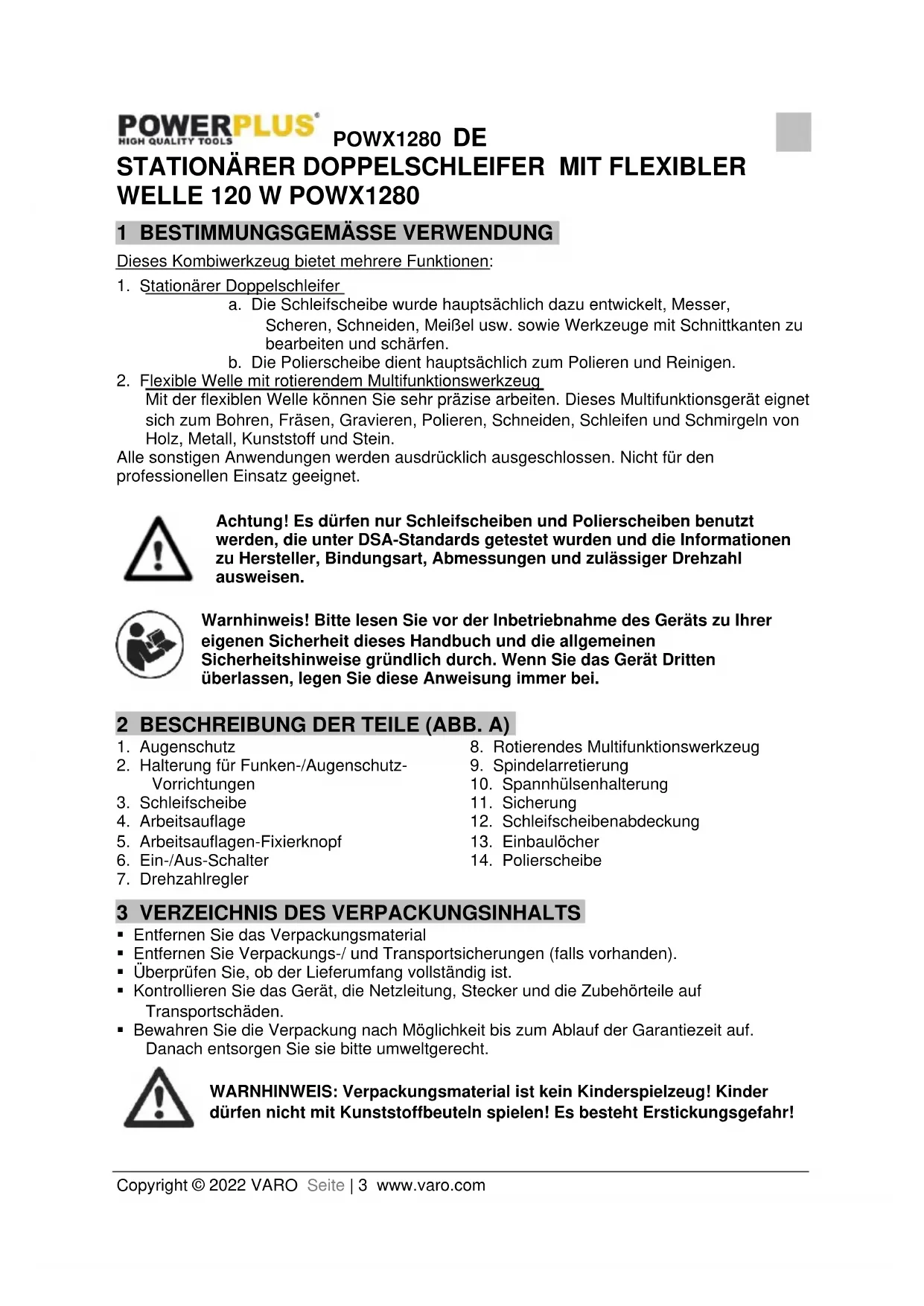- Ihre Tischschleifmaschine eignet sich zum Schärfen von Werkzeugen wie Bohrern oder Meißeln, zur Nachbearbeitung von Werkzeugen (zum Beispiel zum Entgraten von Kanten) und zum Abtragen von Material. Diese Maschine ist allerdings kein Hochleistungsgerät, sondern dient in erster Linie für den leichten Haus- und Hobbygebrauch.POWX1280 DE Copyright © 2022 VARO Seite | 9 www.varo.com