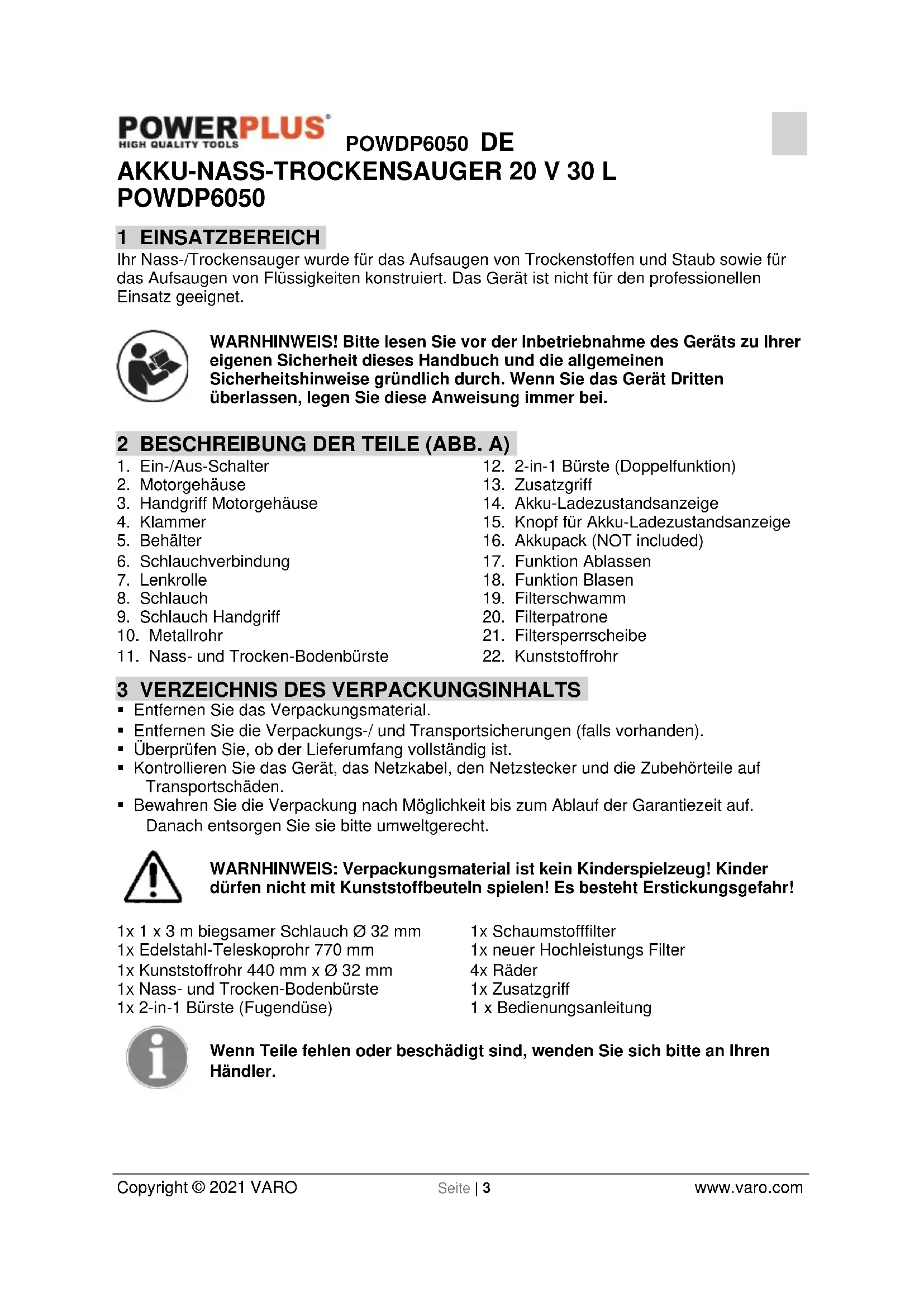 - Bewahren Sie die Verpackung nach Möglichkeit bis zum Ablauf der Garantiezeit auf. Danach entsorgen Sie sie bitte umweltgerecht. WARNHINWEIS: Verpackungsmaterial ist kein Kinderspielzeug! Kinder dürfen nicht mit Kunststoffbeuteln spielen! Es besteht Erstickungsgefahr! 1x 1 x 3 m biegsamer Schlauch Ø 32 mm 1x Edelstahl-Teleskoprohr 770 mm 1x Kunststoffrohr 440 mm x Ø 32 mm 1x Nass- und Trocken-Bodenbürste 1x 2-in-1 Bürste (Fugendüse) 1x Schaumstofffilter 1x neuer Hochleistungs Filter 4x Räder 1x Zusatzgriff 1 x Bedienungsanleitung Wenn Teile fehlen oder beschädigt sind, wenden Sie sich bitte an Ihren Händler.POWDP6050 DE Copyright © 2021 VARO Seite | 4 www.varo.com