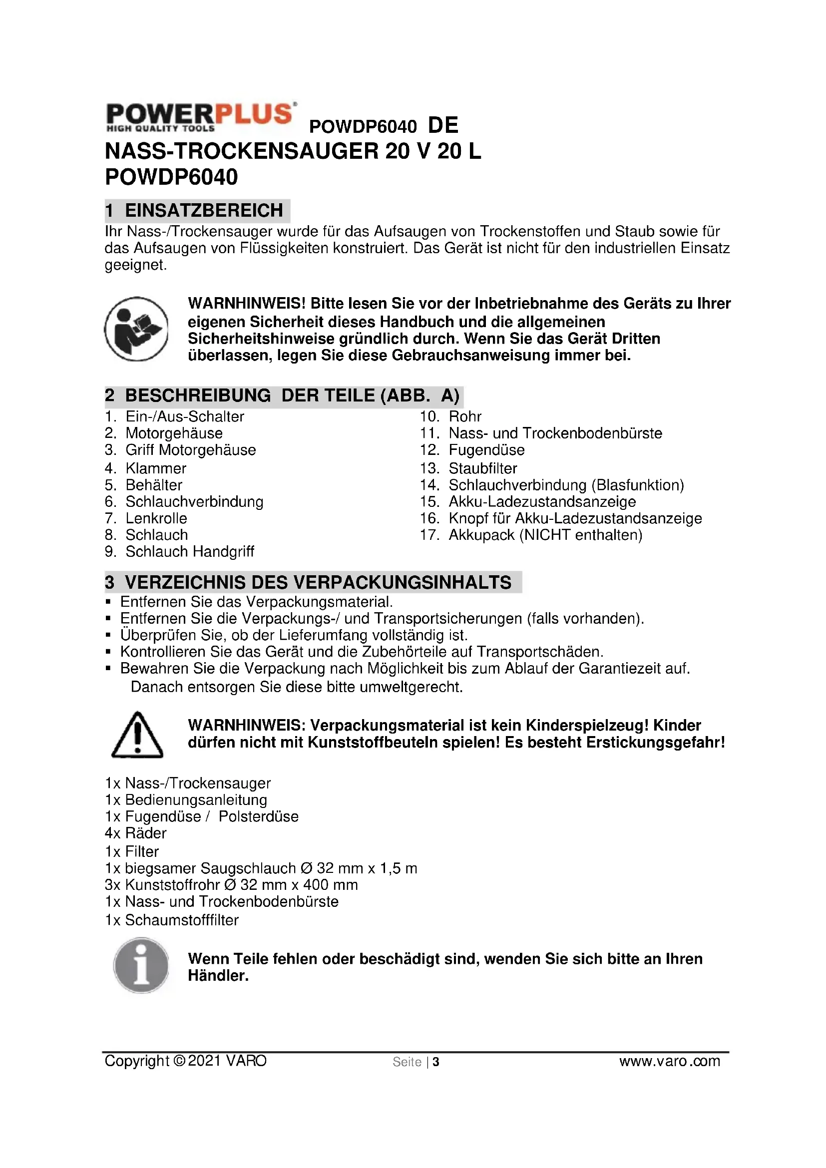 - Bewahren Sie die Verpackung nach Möglichkeit bis zum Ablauf der Garantiezeit auf. Danach entsorgen Sie diese bitte umweltgerecht. WARNHINWEIS: Verpackungsmaterial ist kein Kinderspielzeug! Kinder dürfen nicht mit Kunststoffbeuteln spielen! Es besteht Erstickungsgefahr! 1x Nass-/Trockensauger 1x Bedienungsanleitung 1x Fugendüse / Polsterdüse 4x Räder 1x Filter 1x biegsamer Saugschlauch Ø 32 mm x 1,5 m 3x Kunststoffrohr Ø 32 mm x 400 mm 1x Nass- und Trockenbodenbürste 1x Schaumstofffilter Wenn Teile fehlen oder beschädigt sind, wenden Sie sich bitte an Ihren Händler.POWDP6040 DE Copyright © 2021 VARO Seite | 4 www.varo.com