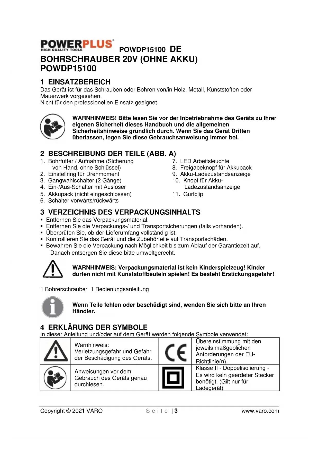 Klasse II - Doppelisolierung - Es wird kein geerdeter Stecker benötigt. (Gilt nur für Ladegerät)POWDP15100 DE Copyright © 2021 VARO S e i t e | 4 www.varo.com