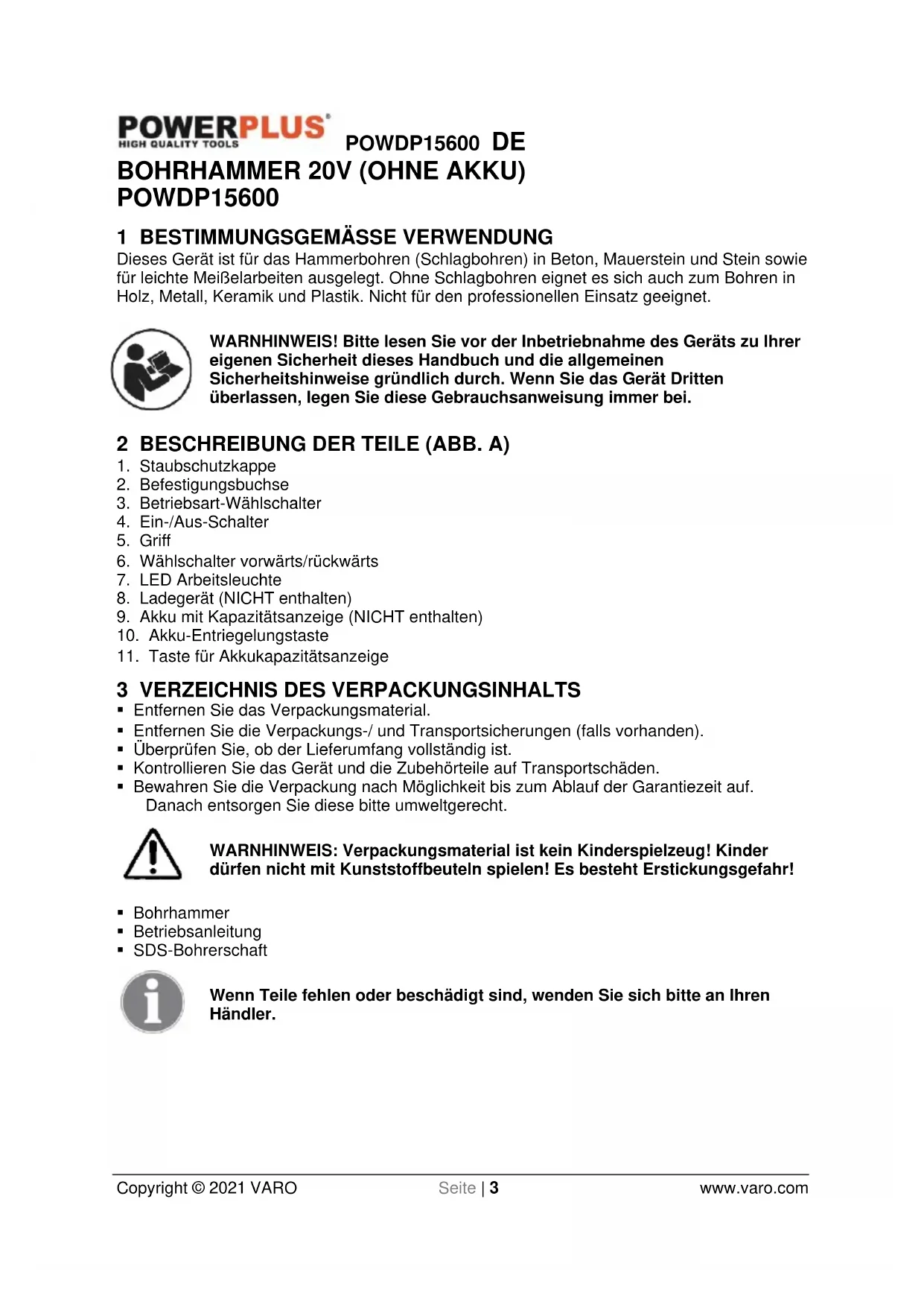 - SDS-Bohrerschaft Wenn Teile fehlen oder beschädigt sind, wenden Sie sich bitte an Ihren Händler.POWDP15600 DE Copyright © 2021 VARO Seite | 4 www.varo.com