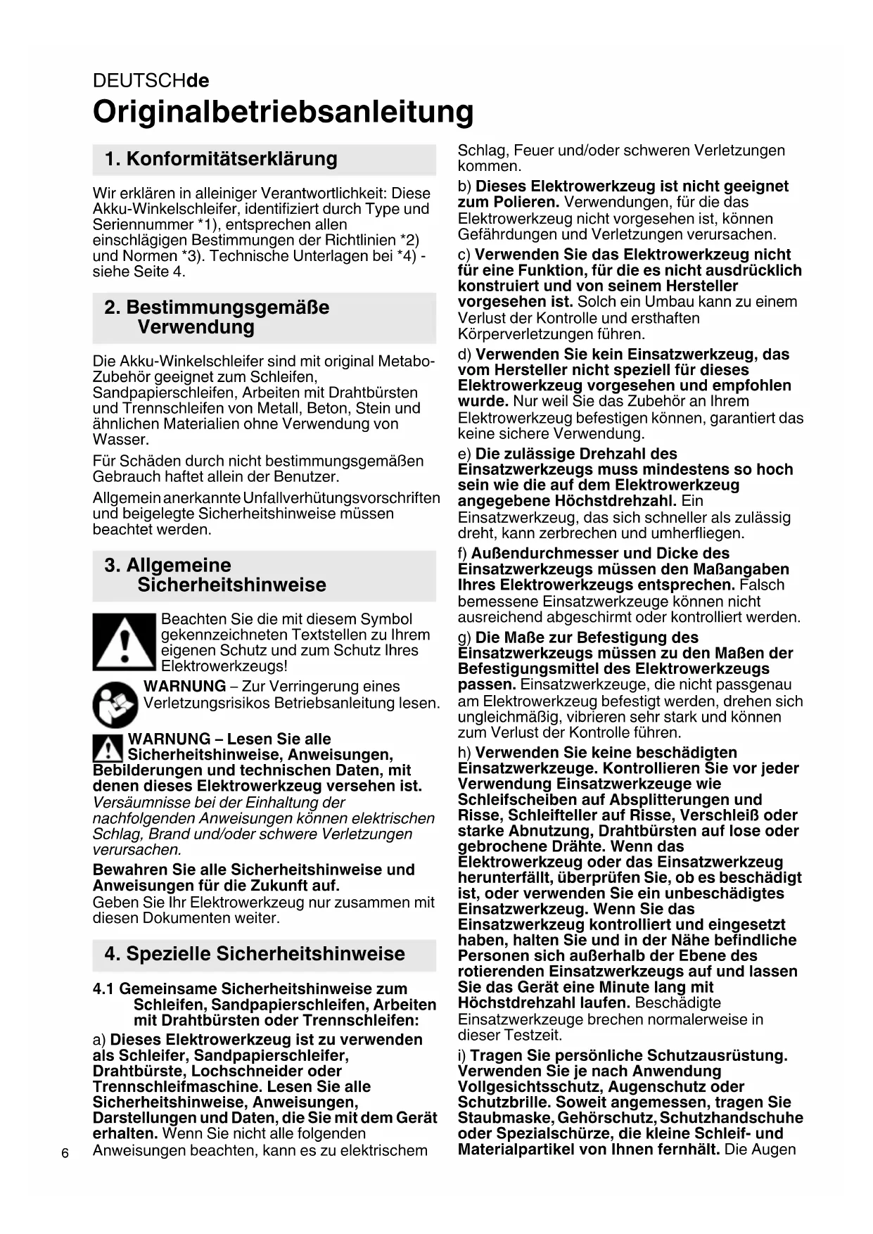 Originalbetriebsanleitung Wir erklären in alleiniger Verantwortlichkeit: Diese Akku-Winkelschleifer, identifiziert durch Type und Seriennummer *1), entsprechen allen einschlägigen Bestimmungen der Richtlinien *2) und Normen *3). Technische Unterlagen bei *4) - siehe Seite 4. Die Akku-Winkelschleifer sind mit original Metabo- Zubehör geeignet zum Schleifen, Sandpapierschleifen, Arbeiten mit Drahtbürsten und Trennschleifen von Metall, Beton, Stein und ähnlichen Materialien ohne Verwendung von Wasser. Für Schäden durch nicht bestimmungsgemäßen Gebrauch haftet allein der Benutzer. Allgemein anerkannte Unfallverhütungsvorschriften und beigelegte Sicherheitshinweise müssen beachtet werden. Beachten Sie die mit diesem Symbol gekennzeichneten Textstellen zu Ihrem eigenen Schutz und zum Schutz Ihres Elektrowerkzeugs! WARNUNG – Zur Verringerung eines Verletzungsrisikos Betriebsanleitung lesen. WARNUNG – Lesen Sie alle Sicherheitshinweise, Anweisungen, Bebilderungen und technischen Daten, mit denen dieses Elektrowerkzeug versehen ist. Versäumnisse bei der Einhaltung der nachfolgenden Anweisungen können elektrischen Schlag, Brand und/oder schwere Verletzungen verursachen. Bewahren Sie alle Sicherheitshinweise und Anweisungen für die Zukunft auf. Geben Sie Ihr Elektrowerkzeug nur zusammen mit diesen Dokumenten weiter.