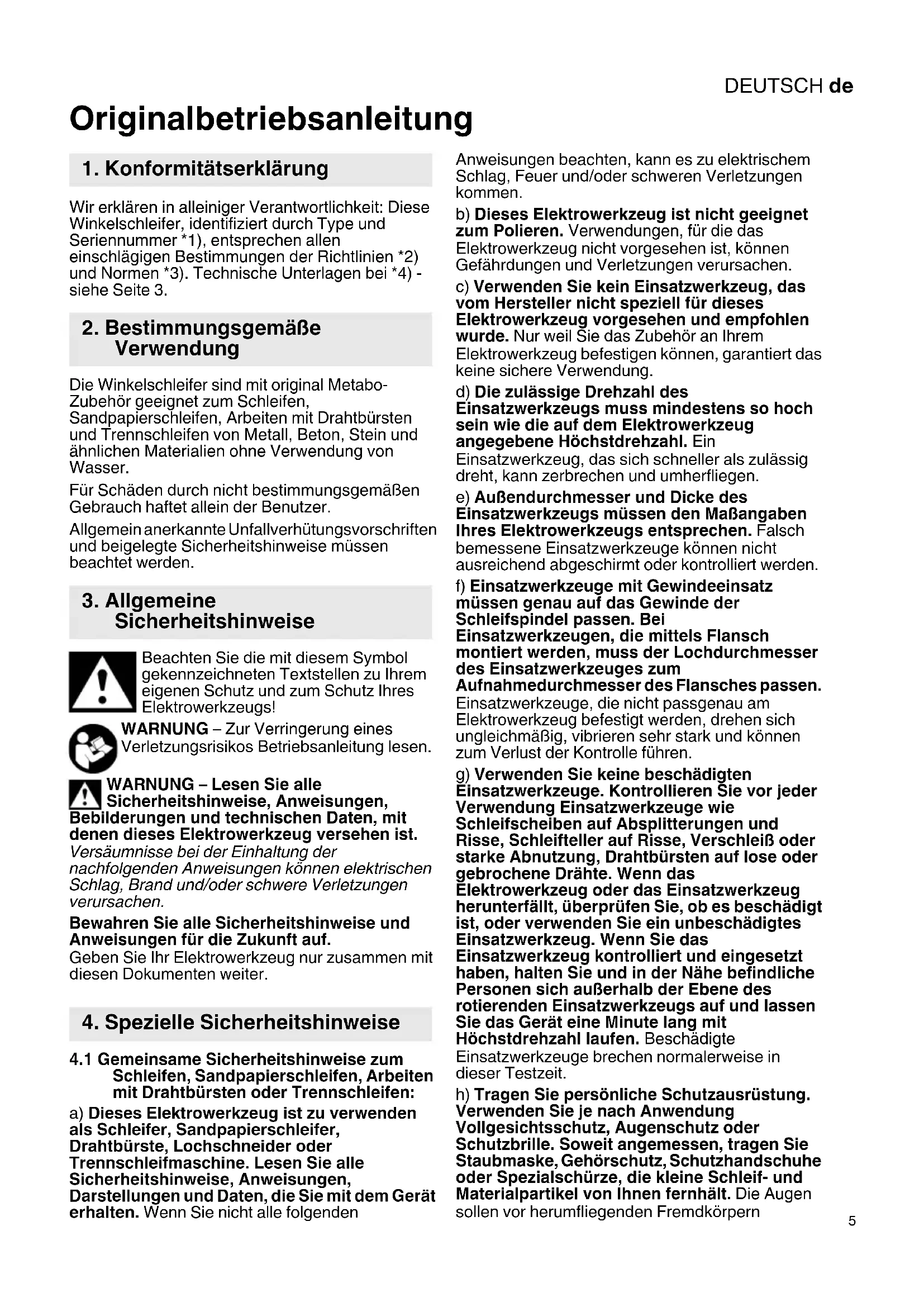 Originalbetriebsanleitung Wir erklären in alleiniger Verantwortlichkeit: Diese Winkelschleifer, identifiziert durch Type und Seriennummer *1), entsprechen allen einschlägigen Bestimmungen der Richtlinien *2) und Normen *3). Technische Unterlagen bei *4) - siehe Seite 3. Die Winkelschleifer sind mit original Metabo- Zubehör geeignet zum Schleifen, Sandpapierschleifen, Arbeiten mit Drahtbürsten und Trennschleifen von Metall, Beton, Stein und ähnlichen Materialien ohne Verwendung von Wasser. Für Schäden durch nicht bestimmungsgemäßen Gebrauch haftet allein der Benutzer. Allgemein anerkannte Unfallverhütungsvorschriften und beigelegte Sicherheitshinweise müssen beachtet werden. Beachten Sie die mit diesem Symbol gekennzeichneten Textstellen zu Ihrem eigenen Schutz und zum Schutz Ihres Elektrowerkzeugs! WARNUNG – Zur Verringerung eines Verletzungsrisikos Betriebsanleitung lesen. WARNUNG – Lesen Sie alle Sicherheitshinweise, Anweisungen, Bebilderungen und technischen Daten, mit denen dieses Elektrowerkzeug versehen ist. Versäumnisse bei der Einhaltung der nachfolgenden Anweisungen können elektrischen Schlag, Brand und/oder schwere Verletzungen verursachen. Bewahren Sie alle Sicherheitshinweise und Anweisungen für die Zukunft auf. Geben Sie Ihr Elektrowerkzeug nur zusammen mit diesen Dokumenten weiter.