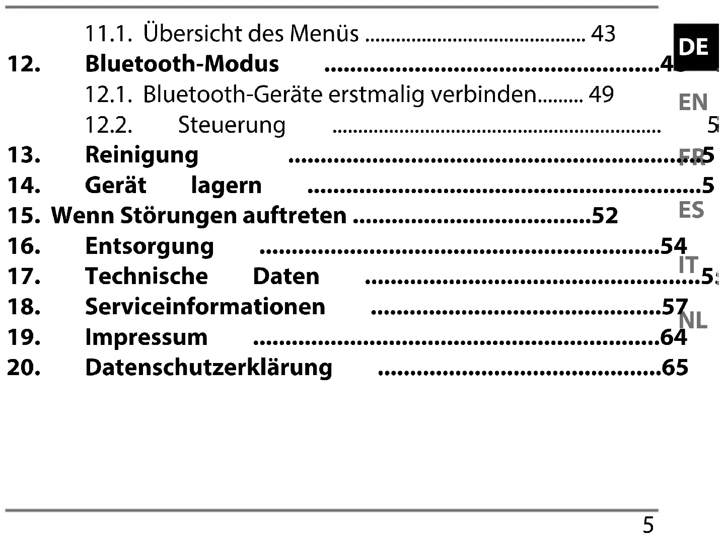 12.1. Bluetooth-Geräte erstmalig verbinden Schalten Sie, wie oben beschrieben, den Bluetooth-Modus ein. Aktivieren Sie ebenso die Bluetooth-Funktion auf Ihrem externen Gerät. Das DAB-Radio be ndet sich im Kopplungsmodus. Führen Sie einen Kopplungsvorgang am externen Gerät durch. Lesen Sie dazu die Anleitung ihres externen Gerätes. Der Name des Radios ist „MD 43461“. Im Display erscheint VERBUNDEN und die Kopplung ist abgeschlossen. Das externe Gerät kann am Radio genutzt werden. Wenn Sie die Bluetooth-Übertragung beenden möch- ten, schalten Sie Bluetooth am externen Gerät aus oder drücken Sie MODE, um in einen anderen Modus zu gelangen.50 Bekannte externe Geräte, die bereits einmal gekoppelt wur- den, werden zukünftig direkt verbunden. Eine erneute Kopp- lung ist nicht notwendig. Zur erneuten Verbindung aktivieren Sie lediglich den Bluetooth-Modus an beiden Geräten. 12.2. Steuerung Die Wiedergabe der Titel sowie die Lautstärke und Sonder- funktionen können sowohl an ihrem externen Gerät als auch am DAB-Radio gesteuert werden. Welche Funktionen verfüg- bar sind, hängt von Ihrem externen Gerät und der verwende- ten der Software ab. Grundsätzlich sind diese Tasten am Gerät für die Steuerung per Bluetooth vorgesehen: /+ (Regler) Lautstärke verringern/erhöhen / (Regler) vorheriger/nächster Titel
