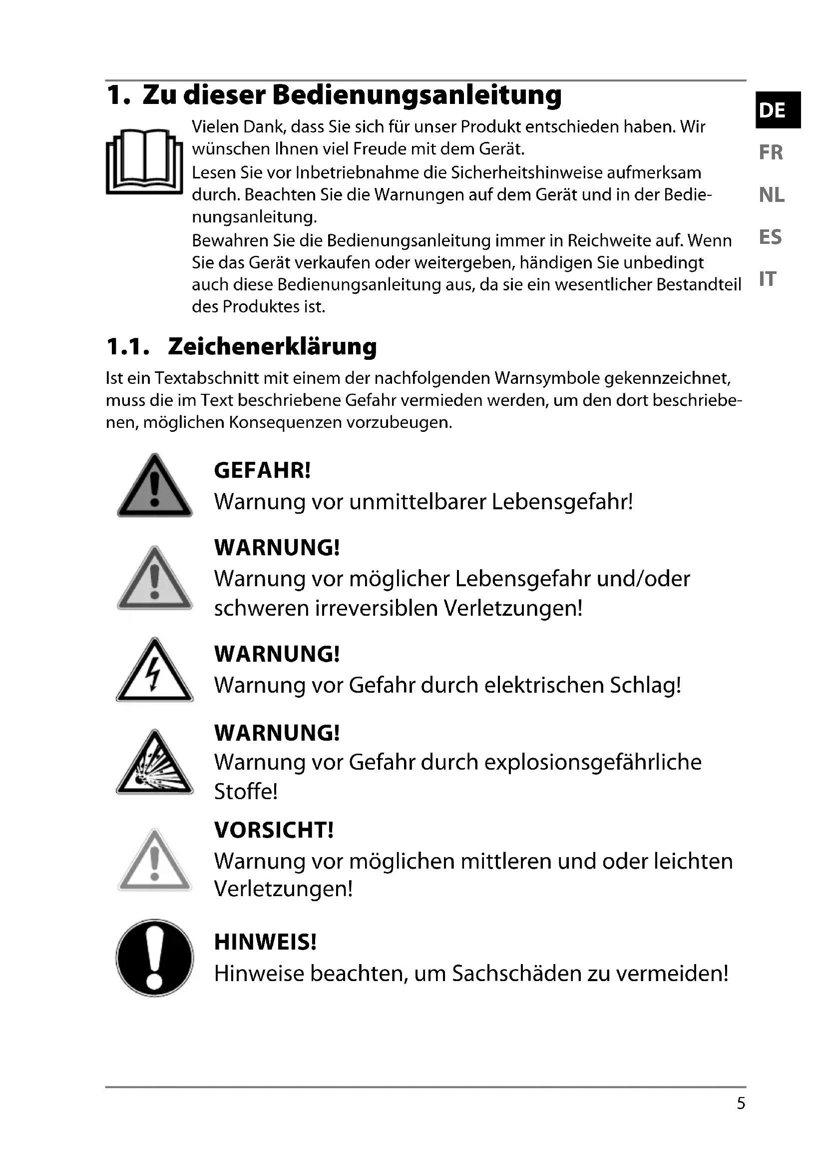 Vielen Dank, dass Sie sich für unser Produkt entschieden haben. Wir wünschen Ihnen viel Freude mit dem Gerät. Lesen Sie vor Inbetriebnahme die Sicherheitshinweise aufmerksam durch. Beachten Sie die Warnungen auf dem Gerät und in der Bedie- nungsanleitung. Bewahren Sie die Bedienungsanleitung immer in Reichweite auf. Wenn Sie das Gerät verkaufen oder weitergeben, händigen Sie unbedingt auch diese Bedienungsanleitung aus, da sie ein wesentlicher Bestandteil des Produktes ist. 1.1. Zeichenerklärung Ist ein Textabschnitt mit einem der nachfolgenden Warnsymbole gekennzeichnet, muss die im Text beschriebene Gefahr vermieden werden, um den dort beschriebe- nen, möglichen Konsequenzen vorzubeugen. GEFAHR! Warnung vor unmittelbarer Lebensgefahr! WARNUNG! Warnung vor möglicher Lebensgefahr und/oder schweren irreversiblen Verletzungen! WARNUNG! Warnung vor Gefahr durch elektrischen Schlag! WARNUNG! Warnung vor Gefahr durch explosionsgefährliche Stoffe! VORSICHT! Warnung vor möglichen mittleren und oder leichten Verletzungen! HINWEIS! Hinweise beachten, um Sachschäden zu vermeiden!6 Weiterführende Informationen für den Gebrauch des Gerätes! HINWEIS! Hinweise in der Bedienungsanleitung beachten!