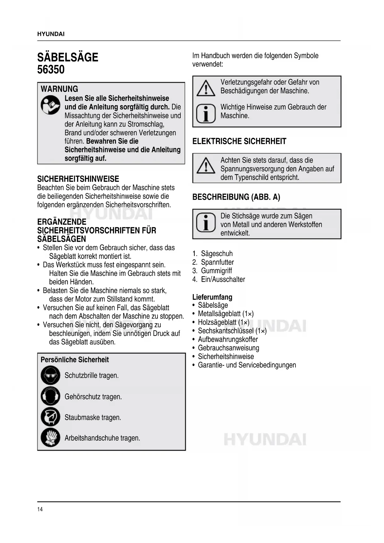 Laden Sie die Anleitung für Ihr Säge kostenlos im PDF-Format! Finden Sie Ihr Handbuch 56350 - HYUNDAI und nehmen Sie Ihr elektronisches Gerät wieder in die Hand. Auf dieser Seite sind alle Dokumente veröffentlicht, die für die Verwendung Ihres Geräts notwendig sind. 56350 von der Marke HYUNDAI.