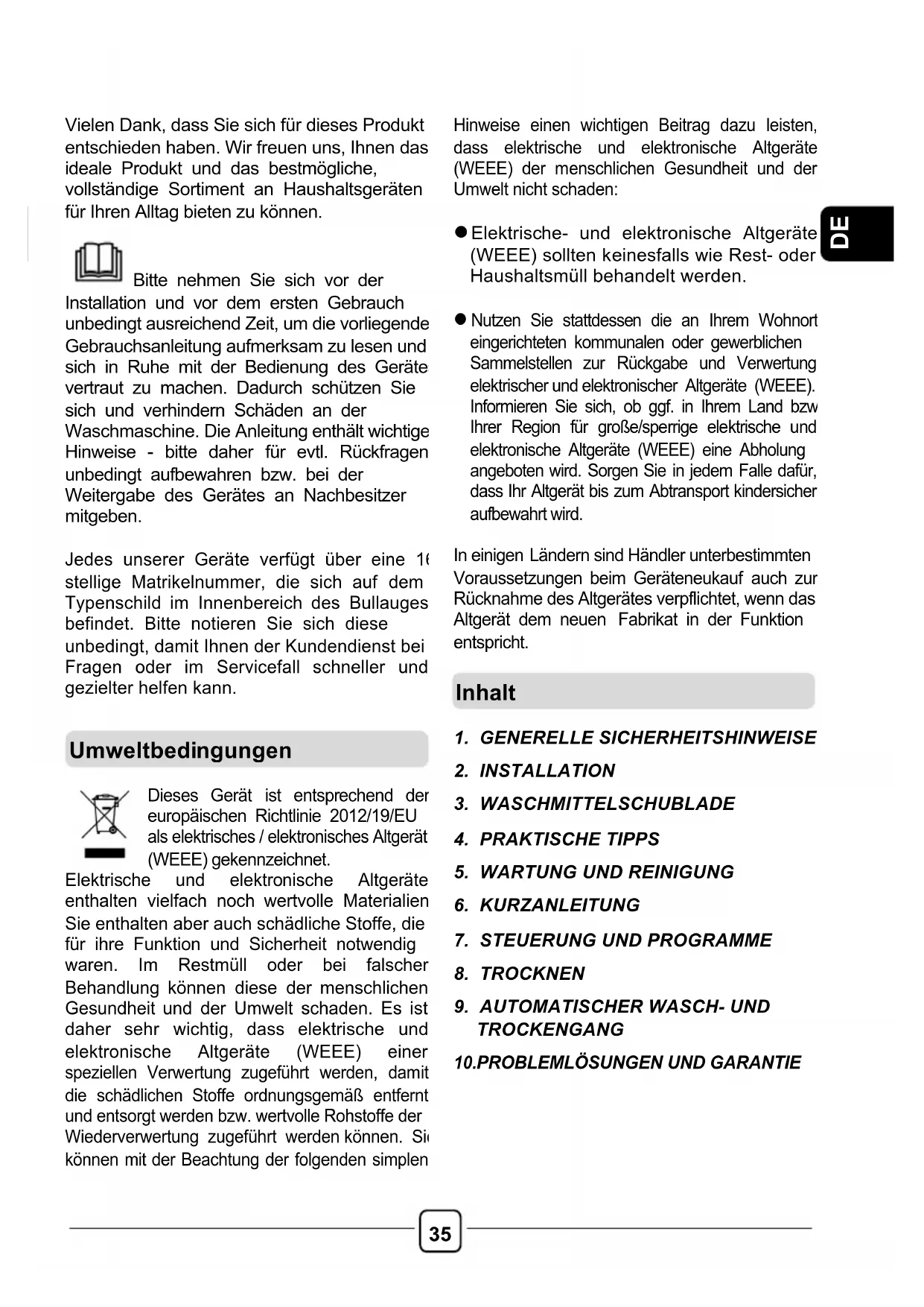Vielen Dank, dass Sie sich für dieses Produkt entschieden haben. Wir freuen uns, Ihnen das ideale Produkt und das bestmögliche, vollständige Sortiment an Haushaltsgeräten für Ihren Alltag bieten zu können. Bitte nehmen Sie sich vor der Installation und vor dem ersten Gebrauch unbedingt ausreichend Zeit, um die vorliegende Gebrauchsanleitung aufmerksam zu lesen und sich in Ruhe mit der Bedienung des Gerätes vertraut zu machen. Dadurch schützen Sie sich und verhindern Schäden an der Waschmaschine. Die Anleitung enthält wichtige Hinweise - bitte daher für evtl. Rückfragen unbedingt aufbewahren bzw. bei der Weitergabe des Gerätes an Nachbesitzer mitgeben. Jedes unserer Geräte verfügt über eine 16- stellige Matrikelnummer, die sich auf dem Typenschild im Innenbereich des Bullauges befindet. Bitte notieren Sie sich diese unbedingt, damit Ihnen der Kundendienst bei Fragen oder im Servicefall schneller und gezielter helfen kann.