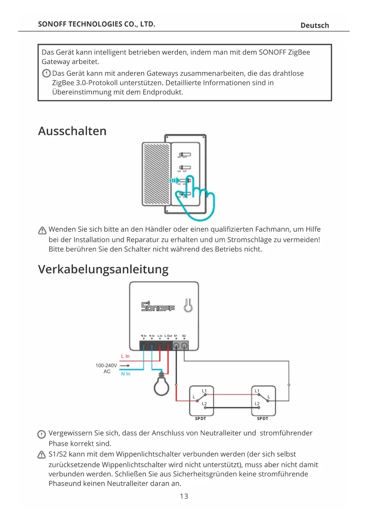 SPDT Das Gerät kann intelligent betrieben werden, indem man mit dem SONOFF ZigBee Gateway arbeitet. Das Gerät kann mit anderen Gateways zusammenarbeiten, die das drahtlose ZigBee 3.0-Protokoll unterstützen. Detaillierte Informationen sind in Übereinstimmung mit dem Endprodukt. Ausschalten Wenden Sie sich bitte an den Händler oder einen qualifizierten Fachmann, um Hilfe bei der Installation und Reparatur zu erhalten und um Stromschläge zu vermeiden! Bitte berühren Sie den Schalter nicht während des Betriebs nicht. Verkabelungsanleitung Vergewissern Sie sich, dass der Anschluss von Neutralleiter und stromführender Phase korrekt sind. S1/S2 kann mit dem Wippenlichtschalter verbunden werden (der sich selbst zurücksetzende Wippenlichtschalter wird nicht unterstützt), muss aber nicht damit verbunden werden. Schließen Sie aus Sicherheitsgründen keine stromführende Phaseund keinen Neutralleiter daran an. 13Amazon Alexa
