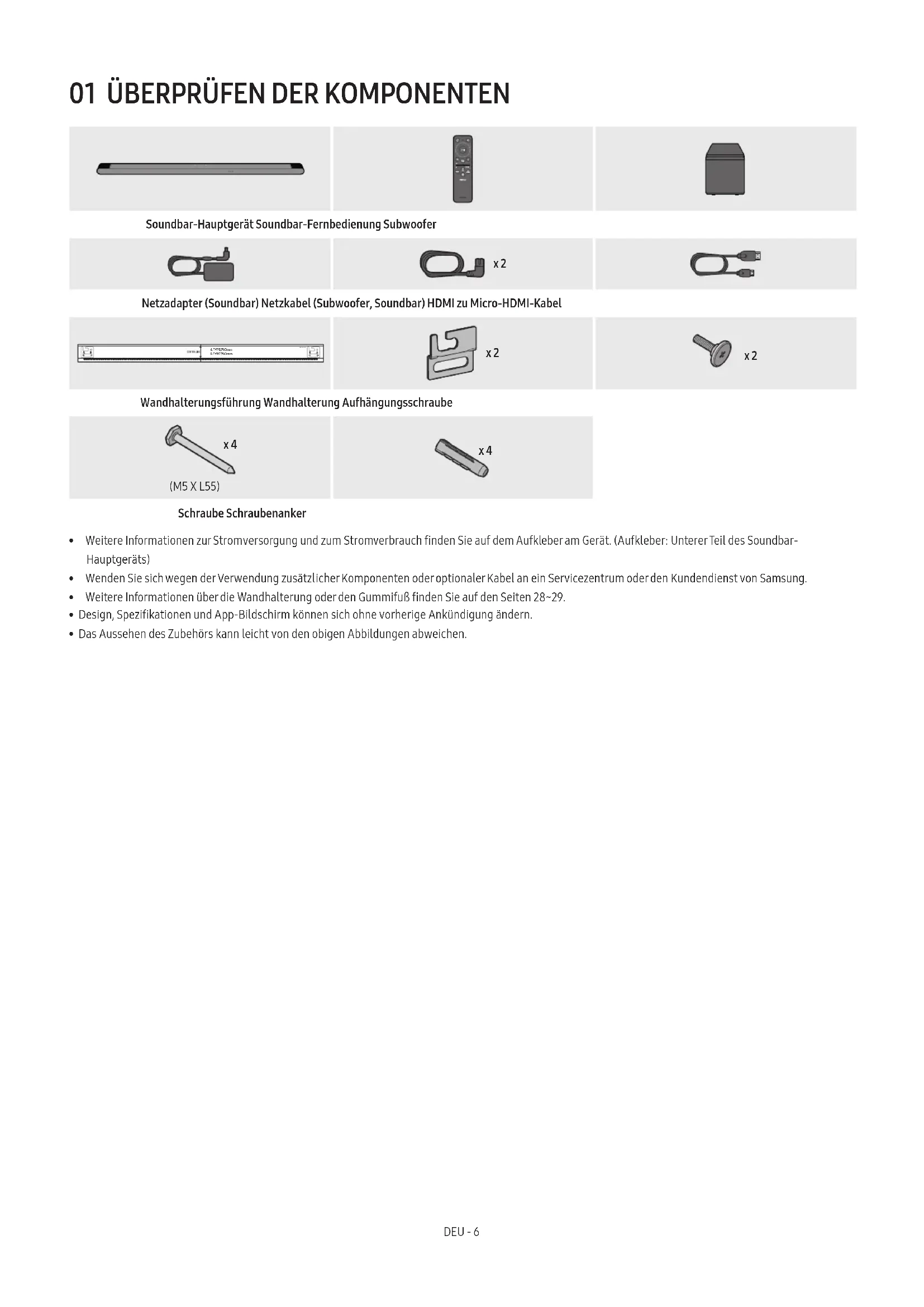 - Weitere Informationen zur Stromversorgung und zum Stromverbrauch nden Sie auf dem Aufkleber am Gerät. (Aufkleber: Unterer Teil des Soundbar- Hauptgeräts)
