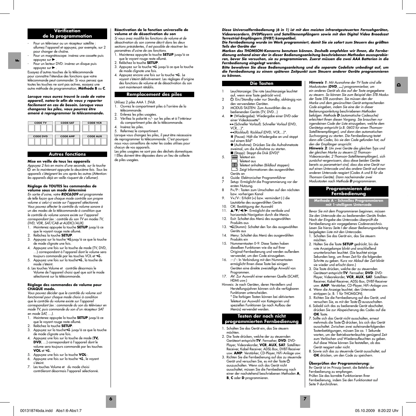 00131874bda.indd Abs1:6-Abs1:7 Diese Universalfernbedienung (6 in 1) ist mit den meisten infrarotgesteuerten Fernsehgeräten, Videorecordern, DVDPlayern und Satellitenempfängern sowie mit den Digital Video Broadcast Terrestrial-Empfängern (DVBT) kompatibel. Die Fernbedienung wurde im Werk programmiert, damit Sie sie sofort zum Steuern des größten Teils der Geräte der Marken des THOMSON-Konzerns benutzen können. Deshalb empfehlen wir Ihnen, die Fernbedienung anhand einer der in dieser Bedienungsanleitung beschriebenen Methoden auszuprobieren, bevor Sie versuchen, sie zu programmieren. Zuerst müssen die zwei AAA Batterien in die Fernbedienung eingelegt werden. Bitte bewahren Sie diese Bedienungsanleitung und die separate Codeliste unbedingt auf, um die Fernbedienung zu einem späteren Zeitpunkt zum Steuern anderer Geräte programmieren zu können.