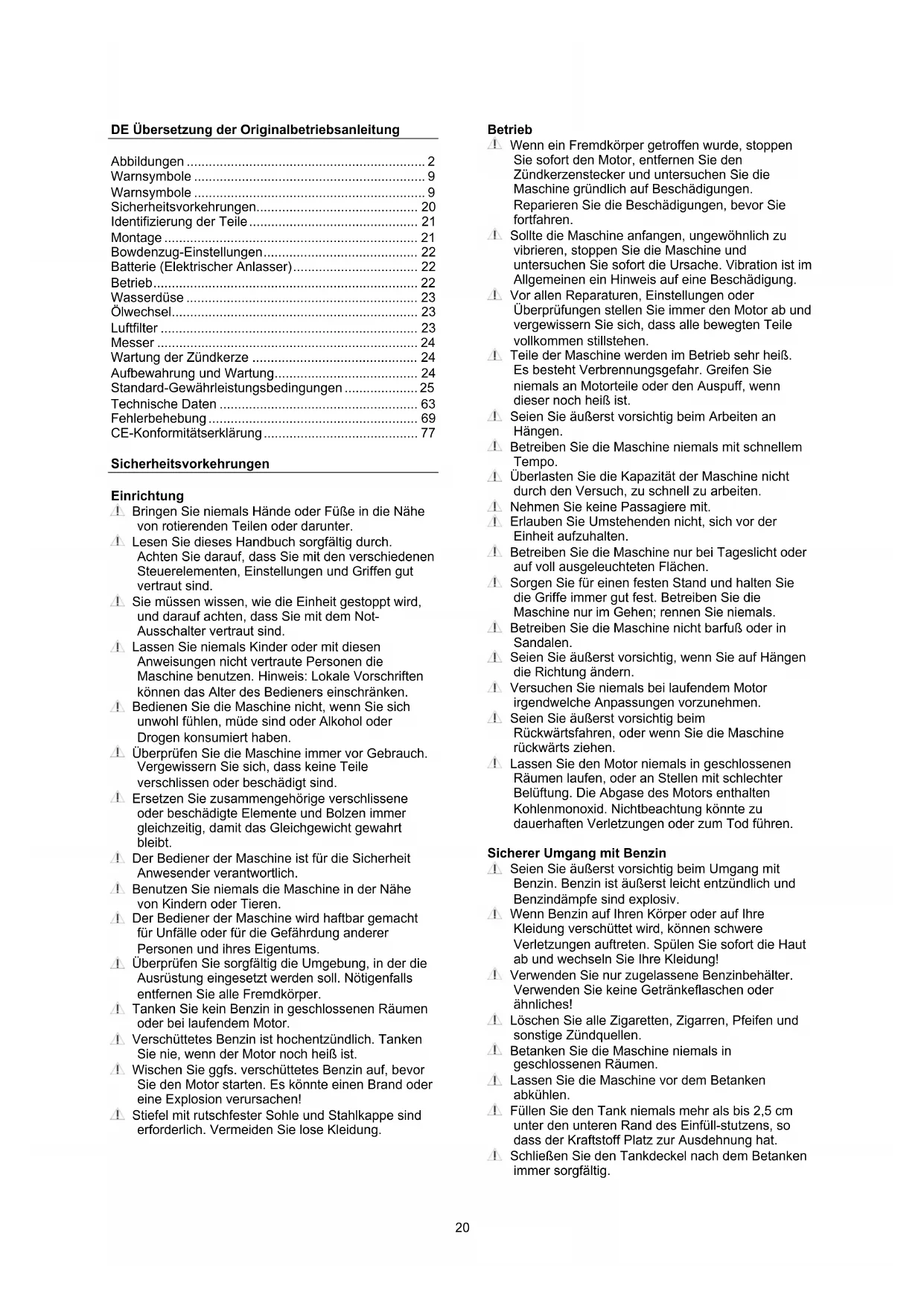 - We reserve the right to change the conditions and accept no liability for any misprints.20 DE Übersetzung der Originalbetriebsanleitung Abbildungen ................................................................. 2 Warnsymbole ............................................................... 9 Warnsymbole ............................................................... 9 Sicherheitsvorkehrungen............................................ 20 Identifizierung der Teile .............................................. 21 Montage ..................................................................... 21 Bowdenzug-Einstellungen .......................................... 22 Batterie (Elektrischer Anlasser) .................................. 22 Betrieb ........................................................................ 22 Wasserdüse ............................................................... 23 Ölwechsel ................................................................... 23 Luftfilter ...................................................................... 23 Messer ....................................................................... 24 Wartung der Zündkerze ............................................. 24 Aufbewahrung und Wartung ....................................... 24 Standard-Gewährleistungsbedingungen .................... 25 Technische Daten ...................................................... 63 Fehlerbehebung ......................................................... 69 CE-Konformitätserklärung .......................................... 77 Sicherheitsvorkehrungen Einrichtung Bringen Sie niemals Hände oder Füße in die Nähe von rotierenden Teilen oder darunter. Lesen Sie dieses Handbuch sorgfältig durch. Achten Sie darauf, dass Sie mit den verschiedenen Steuerelementen, Einstellungen und Griffen gut vertraut sind. Sie müssen wissen, wie die Einheit gestoppt wird, und darauf achten, dass Sie mit dem Not- Ausschalter vertraut sind. Lassen Sie niemals Kinder oder mit diesen Anweisungen nicht vertraute Personen die Maschine benutzen. Hinweis: Lokale Vorschriften können das Alter des Bedieners einschränken. Bedienen Sie die Maschine nicht, wenn Sie sich unwohl fühlen, müde sind oder Alkohol oder Drogen konsumiert haben. Überprüfen Sie die Maschine immer vor Gebrauch. Vergewissern Sie sich, dass keine Teile verschlissen oder beschädigt sind. Ersetzen Sie zusammengehörige verschlissene oder beschädigte Elemente und Bolzen immer gleichzeitig, damit das Gleichgewicht gewahrt bleibt. Der Bediener der Maschine ist für die Sicherheit Anwesender verantwortlich. Benutzen Sie niemals die Maschine in der Nähe von Kindern oder Tieren. Der Bediener der Maschine wird haftbar gemacht für Unfälle oder für die Gefährdung anderer Personen und ihres Eigentums. Überprüfen Sie sorgfältig die Umgebung, in der die Ausrüstung eingesetzt werden soll. Nötigenfalls entfernen Sie alle Fremdkörper. Tanken Sie kein Benzin in geschlossenen Räumen oder bei laufendem Motor. Verschüttetes Benzin ist hochentzündlich. Tanken Sie nie, wenn der Motor noch heiß ist. Wischen Sie ggfs. verschüttetes Benzin auf, bevor Sie den Motor starten. Es könnte einen Brand oder eine Explosion verursachen! Stiefel mit rutschfester Sohle und Stahlkappe sind erforderlich. Vermeiden Sie lose Kleidung.