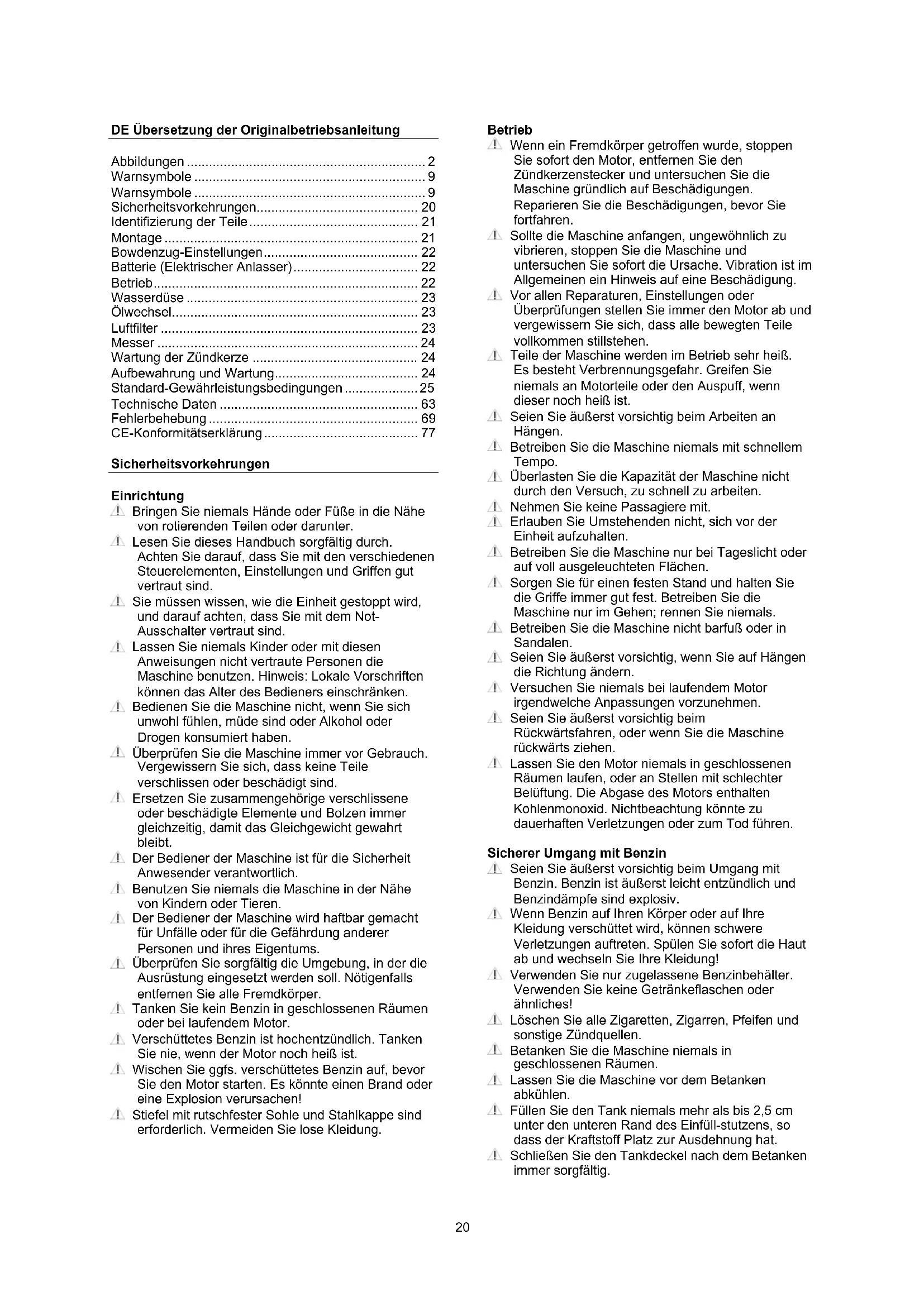 - We reserve the right to change the conditions and accept no liability for any misprints.20 DE Übersetzung der Originalbetriebsanleitung Abbildungen ................................................................. 2 Warnsymbole ............................................................... 9 Warnsymbole ............................................................... 9 Sicherheitsvorkehrungen............................................ 20 Identifizierung der Teile .............................................. 21 Montage ..................................................................... 21 Bowdenzug-Einstellungen .......................................... 22 Batterie (Elektrischer Anlasser) .................................. 22 Betrieb ........................................................................ 22 Wasserdüse ............................................................... 23 Ölwechsel ................................................................... 23 Luftfilter ...................................................................... 23 Messer ....................................................................... 24 Wartung der Zündkerze ............................................. 24 Aufbewahrung und Wartung ....................................... 24 Standard-Gewährleistungsbedingungen .................... 25 Technische Daten ...................................................... 63 Fehlerbehebung ......................................................... 69 CE-Konformitätserklärung .......................................... 77 Sicherheitsvorkehrungen Einrichtung Bringen Sie niemals Hände oder Füße in die Nähe von rotierenden Teilen oder darunter. Lesen Sie dieses Handbuch sorgfältig durch. Achten Sie darauf, dass Sie mit den verschiedenen Steuerelementen, Einstellungen und Griffen gut vertraut sind. Sie müssen wissen, wie die Einheit gestoppt wird, und darauf achten, dass Sie mit dem Not- Ausschalter vertraut sind. Lassen Sie niemals Kinder oder mit diesen Anweisungen nicht vertraute Personen die Maschine benutzen. Hinweis: Lokale Vorschriften können das Alter des Bedieners einschränken. Bedienen Sie die Maschine nicht, wenn Sie sich unwohl fühlen, müde sind oder Alkohol oder Drogen konsumiert haben. Überprüfen Sie die Maschine immer vor Gebrauch. Vergewissern Sie sich, dass keine Teile verschlissen oder beschädigt sind. Ersetzen Sie zusammengehörige verschlissene oder beschädigte Elemente und Bolzen immer gleichzeitig, damit das Gleichgewicht gewahrt bleibt. Der Bediener der Maschine ist für die Sicherheit Anwesender verantwortlich. Benutzen Sie niemals die Maschine in der Nähe von Kindern oder Tieren. Der Bediener der Maschine wird haftbar gemacht für Unfälle oder für die Gefährdung anderer Personen und ihres Eigentums. Überprüfen Sie sorgfältig die Umgebung, in der die Ausrüstung eingesetzt werden soll. Nötigenfalls entfernen Sie alle Fremdkörper. Tanken Sie kein Benzin in geschlossenen Räumen oder bei laufendem Motor. Verschüttetes Benzin ist hochentzündlich. Tanken Sie nie, wenn der Motor noch heiß ist. Wischen Sie ggfs. verschüttetes Benzin auf, bevor Sie den Motor starten. Es könnte einen Brand oder eine Explosion verursachen! Stiefel mit rutschfester Sohle und Stahlkappe sind erforderlich. Vermeiden Sie lose Kleidung.