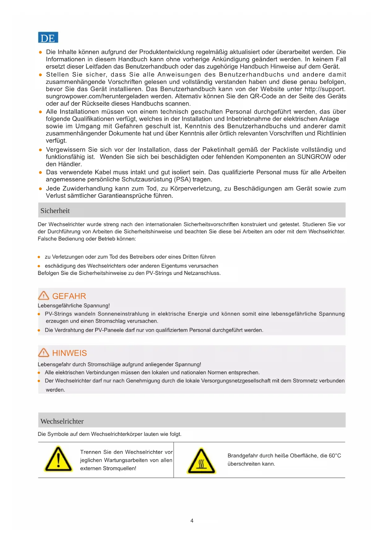 ● Die Inhalte können aufgrund der Produktentwicklung regelmäßig aktualisiert oder überarbeitet werden. Die Informationen in diesem Handbuch kann ohne vorherige Ankündigung geändert werden. In keinem Fall ersetzt dieser Leitfaden das Benutzerhandbuch oder das zugehörige Handbuch Hinweise auf dem Gerät. ● Stellen Sie sicher, dass Sie alle Anweisungen des Benutzerhandbuchs und andere damit zusammenhängende Vorschriften gelesen und vollständig verstanden haben und diese genau befolgen, bevor Sie das Gerät installieren. Das Benutzerhandbuch kann von der Website unter http://support. sungrowpower.com/heruntergeladen werden. Alternativ können Sie den QR-Code an der Seite des Geräts oder auf der Rückseite dieses Handbuchs scannen. ● Alle Installationen müssen von einem technisch geschulten Personal durchgeführt werden, das über folgende Qualikationen verfügt, welches in der Installation und Inbetriebnahme der elektrischen Anlage sowie im Umgang mit Gefahren geschult ist, Kenntnis des Benutzerhandbuchs und anderer damit zusammenhängender Dokumente hat und über Kenntnis aller örtlich relevanten Vorschriften und Richtlinien verfügt. ● Vergewissern Sie sich vor der Installation, dass der Paketinhalt gemäß der Packliste vollständig und funktionsfähig ist. Wenden Sie sich bei beschädigten oder fehlenden Komponenten an SUNGROW oder den Händler. ● Das verwendete Kabel muss intakt und gut isoliert sein. Das qualizierte Personal muss für alle Arbeiten angemessene persönliche Schutzausrüstung (PSA) tragen. ● Jede Zuwiderhandlung kann zum Tod, zu Körperverletzung, zu Beschädigungen am Gerät sowie zum Verlust sämtlicher Garantieansprüche führen. Sicherheit Der Wechselrichter wurde streng nach den internationalen Sicherheitsvorschriften konstruiert und getestet. Studieren Sie vor der Durchführung von Arbeiten die Sicherheitshinweise und beachten Sie diese bei Arbeiten am oder mit dem Wechselrichter. Falsche Bedienung oder Betrieb können: ● zu Verletzungen oder zum Tod des Betreibers oder eines Dritten führen ● eschädigung des Wechselrichters oder anderen Eigentums verursachen Befolgen Sie die Sicherheitshinweise zu den PV-Strings und Netzanschluss. GEFAHR Lebensgefährliche Spannung! ● PV-Strings wandeln Sonneneinstrahlung in elektrische Energie und können somit eine lebensgefährliche Spannung erzeugen und einen Stromschlag verursachen. ● Die Verdrahtung der PV-Paneele darf nur von qualiziertem Personal durchgeführt werden. HINWEIS Lebensgefahr durch Stromschläge aufgrund anliegender Spannung! ● Alle elektrischen Verbindungen müssen den lokalen und nationalen Normen entsprechen. ● Der Wechselrichter darf nur nach Genehmigung durch die lokale Versorgungsnetzgesellschaft mit dem Stromnetz verbunden werden. Wechselrichter Die Symbole auf dem Wechselrichterkörper lauten wie folgt. Trennen Sie den Wechselrichter vor jeglichen Wartungsarbeiten von allen externen Stromquellen! Brandgefahr durch heiße Oberäche, die 60°C überschreiten kann.5 Lesen das Benutzerhandbuch bevor Sie Wartungsarbeiten durchführen! Zulassungszeichen. Lebensgefahr durch Hochspannung! Der Wechselrichter darf nur von qualiziertem Personal geönet und gewartet werden. Lebensgefahr durch Hochspannung! Berühren Sie spannungsführende Teile frühestens 10 Minuten nach dem Trennen von den Stromquellen. TÜV-Prüfzeichen. CE-Zeichen. EU-/EWR-Importeur. Entsorgen Sie den Wechselrichter nicht im Hausmüll. Der Wechselrichter verfügt über keinen Transformator. Zusätzlicher Erdungspunkt. UKCA-Prüfzeichen. RoHS-Kennzeichnung Das Produkt erfüllt die Anforderungen der einschlägigen EU-Richtlinien. CMIM-Prüfzeichen. Nutzer können auch andere Warnsymbole anbringen, sofern örtliche Normen oder Installationsvorgaben dies verlangen. Sicherheitserklärung ● Angaben zur Handhabung netzwerksicherheitsrelevanter Schwachstellen des Produkts und deren Meldung nden Sie über den nebenstehenden QR-Code und auf der folgenden Website: ● Weiterführende Informationen zum Thema Netzwerksicherheit nden Sie im Benutzerhandbuch des Kommunikationsmoduls oder Data Loggers aus dem Lieferumfang des Produkts. EU-Konformitätserklärung im Rahmen der EU-Richtlinien ● Niederspannungsrichtlinie 2014/35/EU (NSP) ● Elektromagnetische Verträglichkeit 2014/30/EU (EMV) ● Beschränkung der Verwendung bestimmter gefährlicher Stoe 2011/65/EU und 2015/863/EU (RoHS) ● Die Herstellerin Sungrow Power Supply Co., Ltd., China bestätigt hiermit, dass das Produkt SG3.0-20RT&SG5.0-20RT-P2 den grundlegenden Anforderungen und anderen einschlägigen Bestimmungen der Richtlinien 2014/35/EU, 2014/30/ EU, 2011/65/EU, 2015/863/EU entspricht. Die vollständige EU-Konformitätserklärung kann unterunter https://support. sungrowpower.com/PdfDetail?id=1697882136156495873 ● Die Daten des mit dem Wechselrichter gelieferten Kommunikationsmoduls und die technischen Parameter der drahtlosen Kommunikation sind der nachstehenden Tabelle zu entnehmen. Maßgeblich ist das tatsächlich gelieferte Modell des Kommunikationsmoduls.Die EU-Konformitätserklärung für das Kommunikationsmodul kann unter support.sungrowpower. com abgerufen werden. WiNet-S/WiNet-S2:6 Funktechnik WLANI 802.11b/g/n20/n40 Funkspektrum 802.11b/g/n 802.11n40 2,412–2,472 GHz 2,422–2,462 GHz Maximale Übertragungsleistung ≤ 20 dBm Die oben aufgeführten technischen Parameter gelten nur für EU-Länder. Hersteller : Sungrow Power Supply Co., Ltd. Nr. 1699. Xiyou Road,Hefei 230088.P.R.China Nur für die EU EU/EWR-Importeur: Sungrow Deutschland GmbH Balanstraße 59, 81541 München, Deutschland GEFAHR Lebensgefahr durch Stromschläge aufgrund anliegender Spannung ● Das Gehäuse darf niemals geönet werden. Durch das nicht autorisierte Önen des Wechselrichters verfallen sämtliche Garantie- und Gewährleistungsansprüche sowie in den meisten Fällen auch die Betriebserlaubnis erlischt. ● Durch das Entfernen des Gehäusedeckels werden stromführend