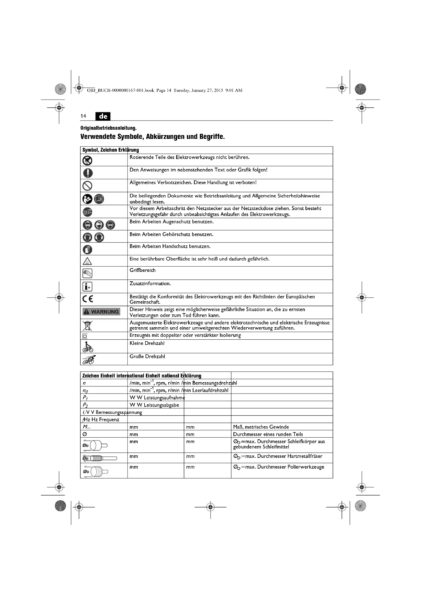 Originalbetriebsanleitung. Verwendete Symbole, Abkürzungen und Begriffe. Symbol, Zeichen Erklärung Rotierende Teile des Elektrowerkzeugs nicht berühren. Den Anweisungen im nebenstehenden Text oder Grafik folgen! Allgemeines Verbotszeichen. Diese Handlung ist verboten! Die beiliegenden Dokumente wie Betriebsanleitung und Allgemeine Sicherheitshinweise unbedingt lesen. Vor diesem Arbeitsschritt den Netzstecker aus der Netzsteckdose ziehen. Sonst besteht Verletzungsgefahr durch unbeabsichtigtes Anlaufen des Elektrowerkzeugs. Beim Arbeiten Augenschutz benutzen. Beim Arbeiten Gehörschutz benutzen. Beim Arbeiten Handschutz benutzen. Eine berührbare Oberfläche ist sehr heiß und dadurch gefährlich. Griffbereich Zusatzinformation. Bestätigt die Konformität des Elektrowerkzeugs mit den Richtlinien der Europäischen Gemeinschaft. Dieser Hinweis zeigt eine möglicherweise gefährliche Situation an, die zu ernsten Verletzungen oder zum Tod führen kann. Ausgemusterte Elektrowerkzeuge und andere elektrotechnische und elektrische Erzeugnisse getrennt sammeln und einer umweltgerechten Wiederverwertung zuführen. Erzeugnis mit doppelter oder verstärkter Isolierung Kleine Drehzahl Große Drehzahl WARNUNG Zeichen Einheit international Einheit national Erklärung