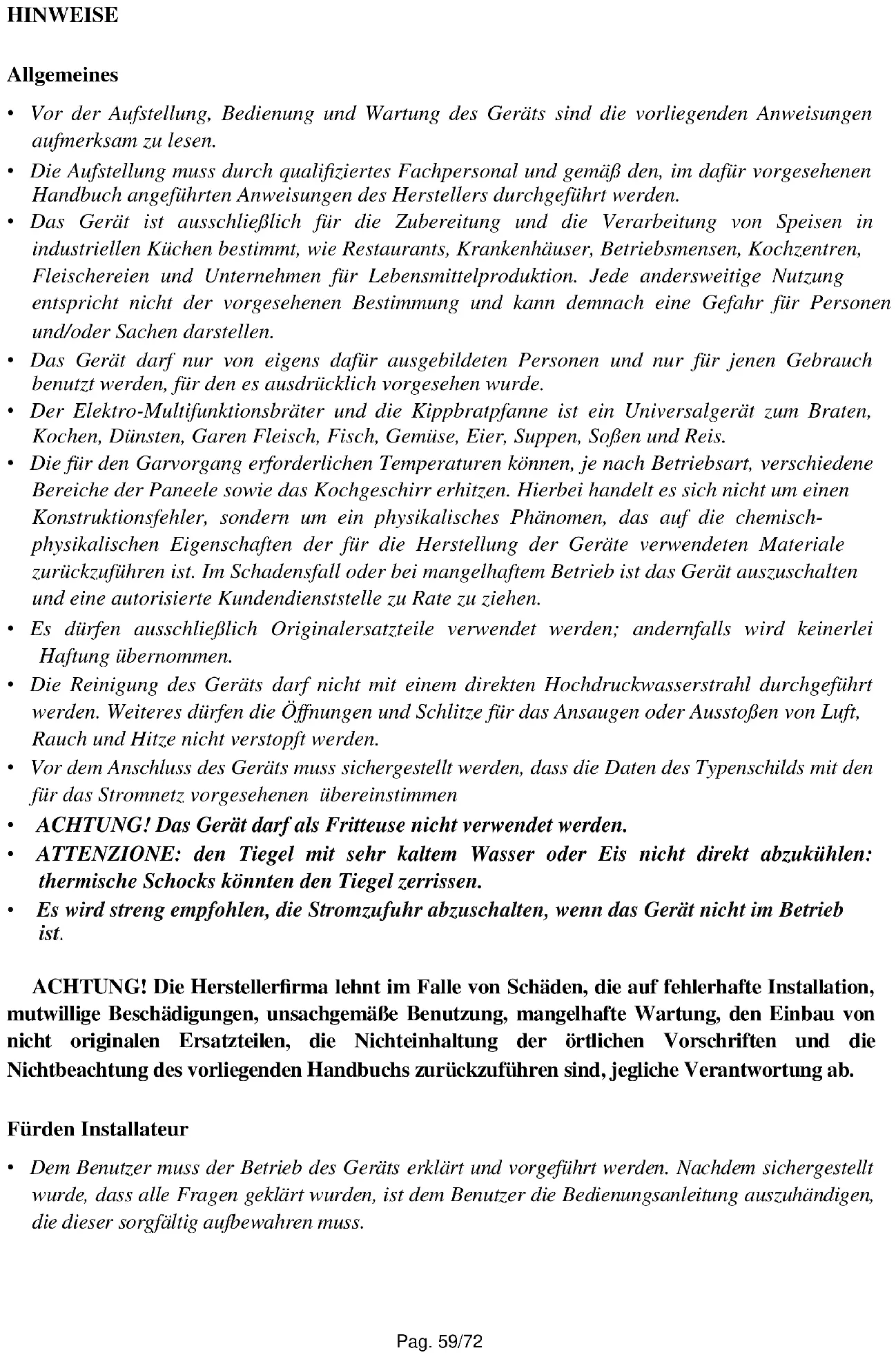 - Dem Benutzer muss der Betrieb des Geräts erklärt und vorgeführt werden. Nachdem sichergestellt wurde, dass alle Fragen geklärt wurden, ist dem Benutzer die Bedienungsanleitung auszuhändigen, die dieser sorgfältig aufbewahren muss.Pag. 60/72