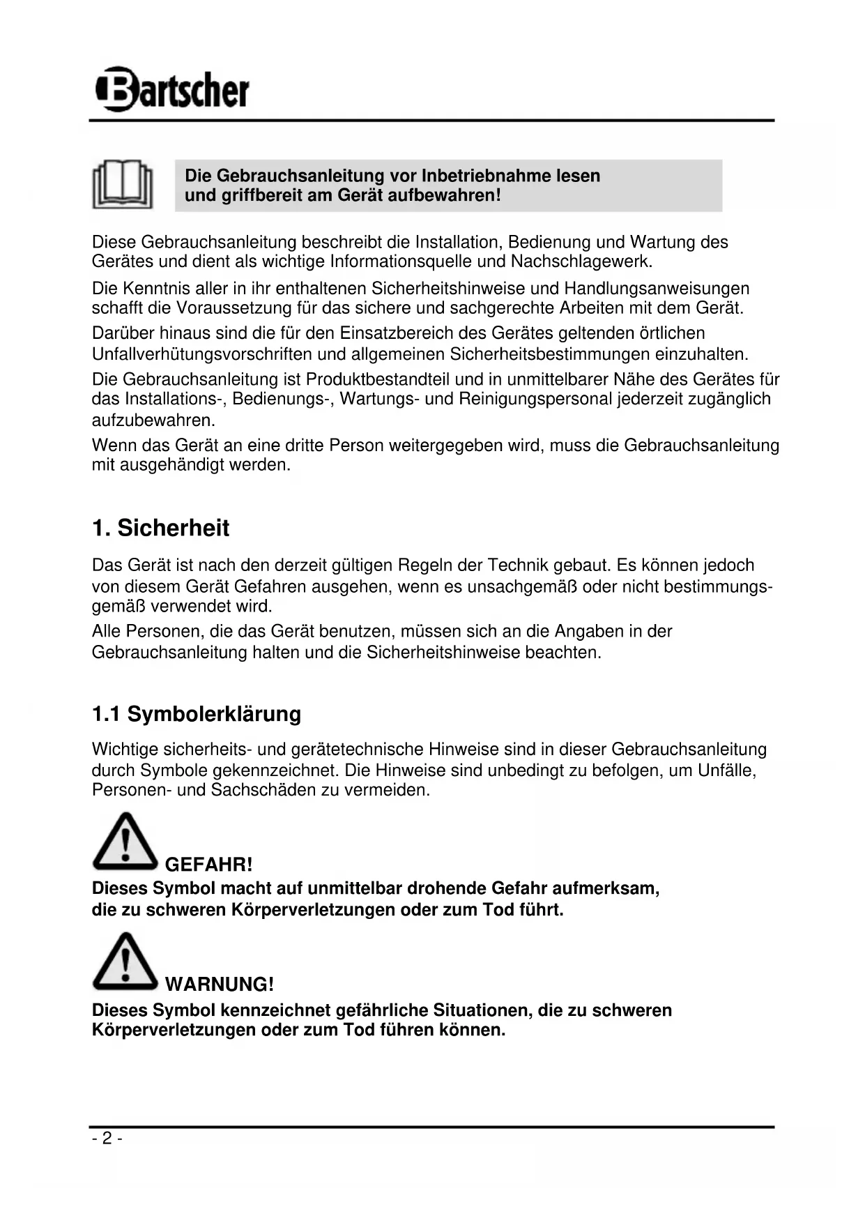 Bartscher GmbH Franz-Kleine-Str. 28 33154 Salzkotten Tel.: +49 (0) 5258 971-0 Service-Hotline: 0180 5 971 197 Germany Fax: +49 (0) 5258 971- 120 (14ct/Min. aus dem deutschen Festnetz) D/A/CH- 2 -