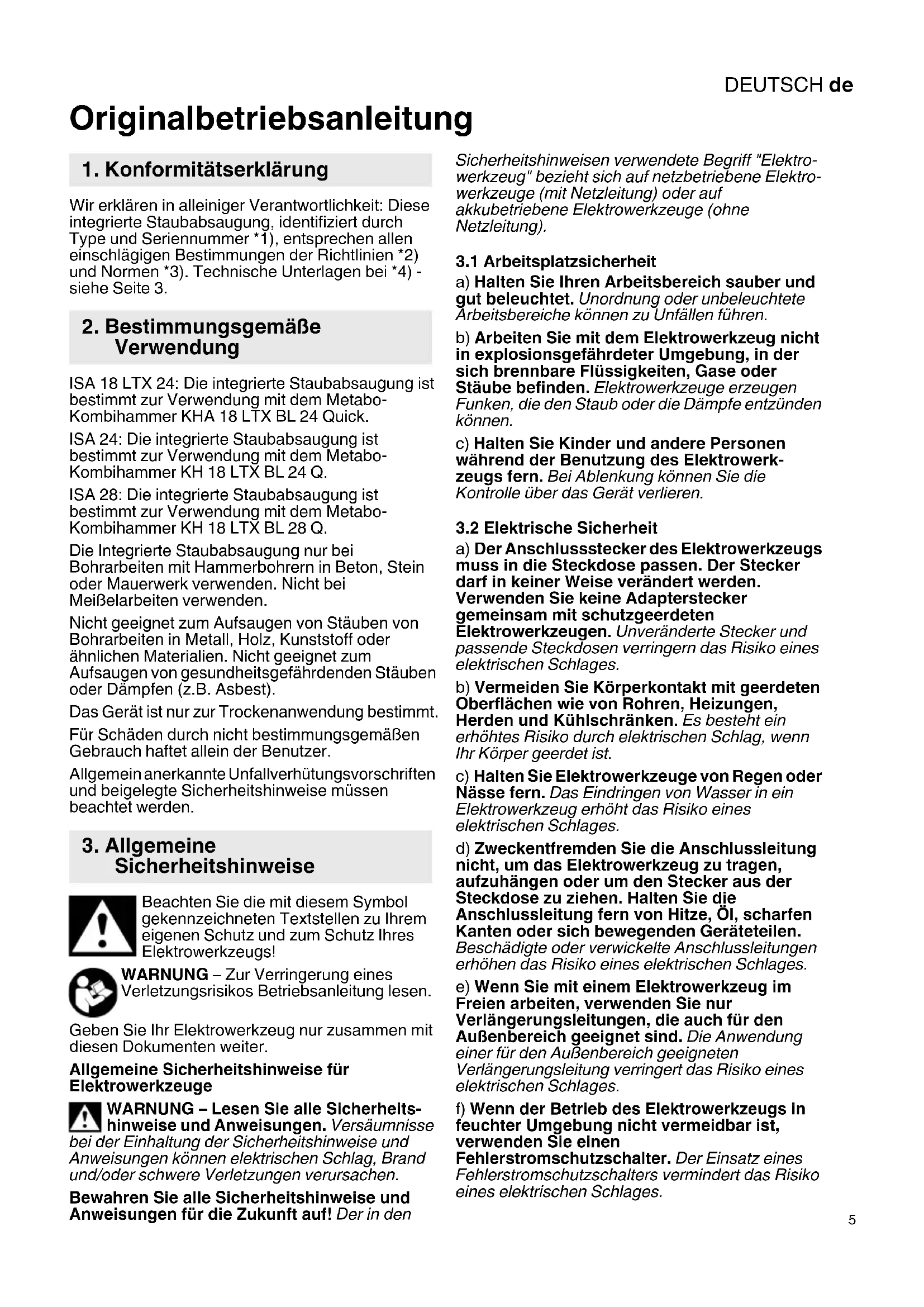 Originalbetriebsanleitung Wir erklären in alleiniger Verantwortlichkeit: Diese integrierte Staubabsaugung, identifiziert durch Type und Seriennummer *1), entsprechen allen einschlägigen Bestimmungen der Richtlinien *2) und Normen *3). Technische Unterlagen bei *4) - siehe Seite 3. ISA 18 LTX 24: Die integrierte Staubabsaugung ist bestimmt zur Verwendung mit dem Metabo- Kombihammer KHA 18 LTX BL 24 Quick. ISA 24: Die integrierte Staubabsaugung ist bestimmt zur Verwendung mit dem Metabo- Kombihammer KH 18 LTX BL 24 Q. ISA 28: Die integrierte Staubabsaugung ist bestimmt zur Verwendung mit dem Metabo- Kombihammer KH 18 LTX BL 28 Q. Die Integrierte Staubabsaugung nur bei Bohrarbeiten mit Hammerbohrern in Beton, Stein oder Mauerwerk verwenden. Nicht bei Meißelarbeiten verwenden. Nicht geeignet zum Aufsaugen von Stäuben von Bohrarbeiten in Metall, Holz, Kunststoff oder ähnlichen Materialien. Nicht geeignet zum Aufsaugen von gesundheitsgefährdenden Stäuben oder Dämpfen (z.B. Asbest). Das Gerät ist nur zur Trockenanwendung bestimmt. Für Schäden durch nicht bestimmungsgemäßen Gebrauch haftet allein der Benutzer. Allgemein anerkannte Unfallverhütungsvorschriften und beigelegte Sicherheitshinweise müssen beachtet werden. Beachten Sie die mit diesem Symbol gekennzeichneten Textstellen zu Ihrem eigenen Schutz und zum Schutz Ihres Elektrowerkzeugs! WARNUNG – Zur Verringerung eines Verletzungsrisikos Betriebsanleitung lesen. Geben Sie Ihr Elektrowerkzeug nur zusammen mit diesen Dokumenten weiter. Allgemeine Sicherheitshinweise für Elektrowerkzeuge WARNUNG – Lesen Sie alle Sicherheits- hinweise und Anweisungen. Versäumnisse bei der Einhaltung der Sicherheitshinweise und Anweisungen können elektrischen Schlag, Brand und/oder schwere Verletzungen verursachen. Bewahren Sie alle Sicherheitshinweise und Anweisungen für die Zukunft auf! Der in den Sicherheitshinweisen verwendete Begriff "Elektro- werkzeug" bezieht sich auf netzbetriebene Elektro- werkzeuge (mit Netzleitung) oder auf akkubetriebene Elektrowerkzeuge (ohne Netzleitung).
