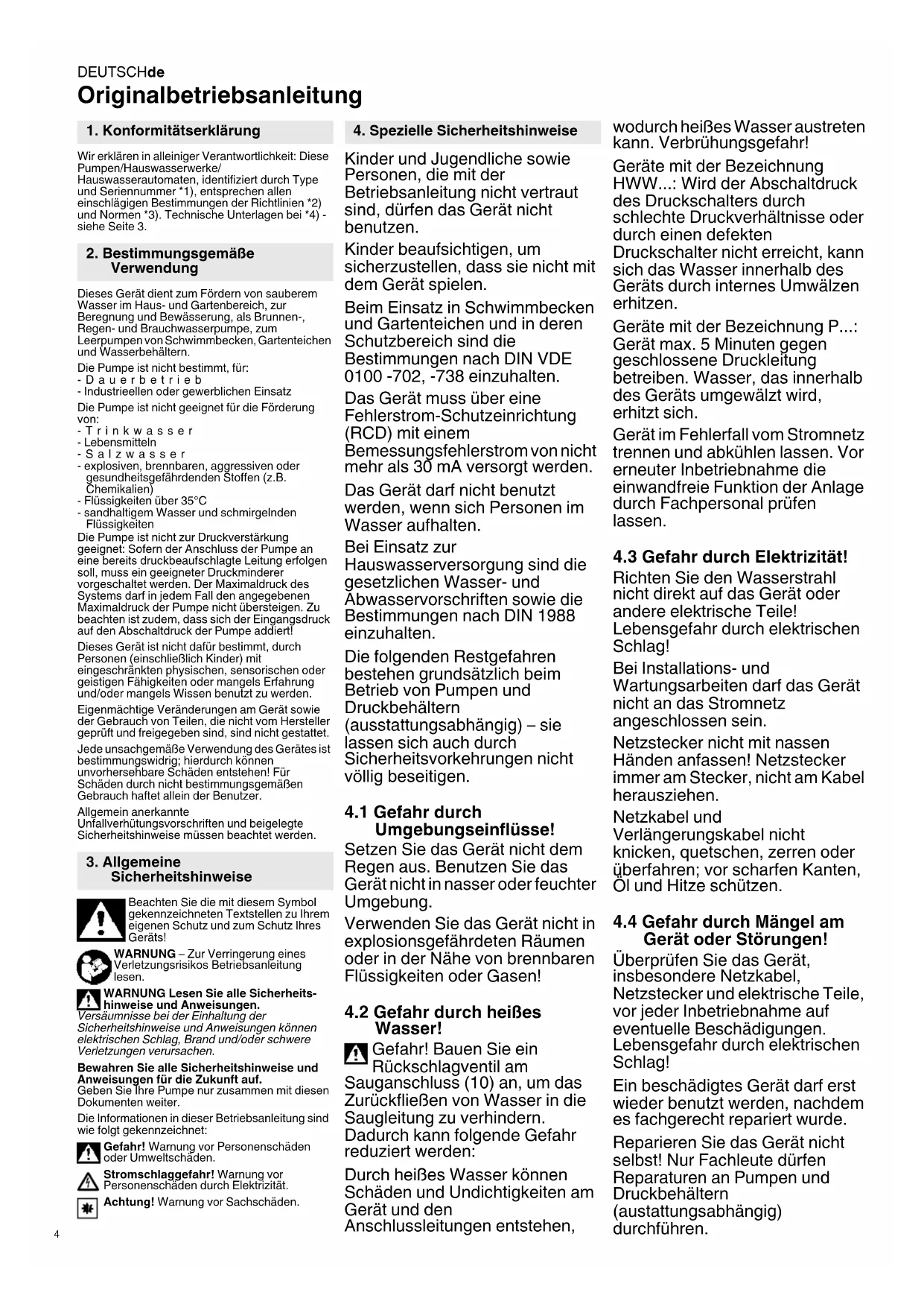 Originalbetriebsanleitung Wir erklären in alleiniger Verantwortlichkeit: Diese Pumpen/Hauswasserwerke/ Hauswasserautomaten, identifiziert durch Type und Seriennummer *1), entsprechen allen einschlägigen Bestimmungen der Richtlinien *2) und Normen *3). Technische Unterlagen bei *4) - siehe Seite 3. Dieses Gerät dient zum Fördern von sauberem Wasser im Haus- und Gartenbereich, zur Beregnung und Bewässerung, als Brunnen-, Regen- und Brauchwasserpumpe, zum Leerpumpen von Schwimmbecken, Gartenteichen und Wasserbehältern. Die Pumpe ist nicht bestimmt, für: -Dauerbetrieb - Industrieellen oder gewerblichen Einsatz Die Pumpe ist nicht geeignet für die Förderung von: -Trinkwasser - Lebensmitteln -Salzwasser - explosiven, brennbaren, aggressiven oder gesundheitsgefährdenden Stoffen (z.B. Chemikalien) - Flüssigkeiten über 35°C - sandhaltigem Wasser und schmirgelnden Flüssigkeiten Die Pumpe ist nicht zur Druckverstärkung geeignet: Sofern der Anschluss der Pumpe an eine bereits druckbeaufschlagte Leitung erfolgen soll, muss ein geeigneter Druckminderer vorgeschaltet werden. Der Maximaldruck des Systems darf in jedem Fall den angegebenen Maximaldruck der Pumpe nicht übersteigen. Zu beachten ist zudem, dass sich der Eingangsdruck auf den Abschaltdruck der Pumpe addiert! Dieses Gerät ist nicht dafür bestimmt, durch Personen (einschließlich Kinder) mit eingeschränkten physischen, sensorischen oder geistigen Fähigkeiten oder mangels Erfahrung und/oder mangels Wissen benutzt zu werden. Eigenmächtige Veränderungen am Gerät sowie der Gebrauch von Teilen, die nicht vom Hersteller geprüft und freigegeben sind, sind nicht gestattet. Jede unsachgemäße Verwendung des Gerätes ist bestimmungswidrig; hierdurch können unvorhersehbare Schäden entstehen! Für Schäden durch nicht bestimmungsgemäßen Gebrauch haftet allein der Benutzer. Allgemein anerkannte Unfallverhütungsvorschriften und beigelegte Sicherheitshinweise müssen beachtet werden. Beachten Sie die mit diesem Symbol gekennzeichneten Textstellen zu Ihrem eigenen Schutz und zum Schutz Ihres Geräts! WARNUNG – Zur Verringerung eines Verletzungsrisikos Betriebsanleitung lesen. WARNUNG Lesen Sie alle Sicherheits- hinweise und Anweisungen. Versäumnisse bei der Einhaltung der Sicherheitshinweise und Anweisungen können elektrischen Schlag, Brand und/oder schwere Verletzungen verursachen. Bewahren Sie alle Sicherheitshinweise und Anweisungen für die Zukunft auf. Geben Sie Ihre Pumpe nur zusammen mit diesen Dokumenten weiter. Die Informationen in dieser Betriebsanleitung sind wie folgt gekennzeichnet: Gefahr! Warnung vor Personenschäden oder Umweltschäden. Stromschlaggefahr! Warnung vor Personenschäden durch Elektrizität. Achtung! Warnung vor Sachschäden. Kinder und Jugendliche sowie Personen, die mit der Betriebsanleitung nicht vertraut sind, dürfen das Gerät nicht benutzen. Kinder beaufsichtigen, um sicherzustellen, dass sie nicht mit dem Gerät spielen. Beim Einsatz in Schwimmbecken und Gartenteichen und in deren Schutzbereich sind die Bestimmungen nach DIN VDE 0100 -702, -738 einzuhalten. Das Gerät muss über eine Fehlerstrom-Schutzeinrichtung (RCD) mit einem Bemessungsfehlerstrom von nicht mehr als 30 mA versorgt werden. Das Gerät darf nicht benutzt werden, wenn sich Personen im Wasser aufhalten. Bei Einsatz zur Hauswasserversorgung sind die gesetzlichen Wasser- und Abwasservorschriften sowie die Bestimmungen nach DIN 1988 einzuhalten. Die folgenden Restgefahren bestehen grundsätzlich beim Betrieb von Pumpen und Druckbehältern (ausstattungsabhängig) – sie lassen sich auch durch Sicherheitsvorkehrungen nicht völlig beseitigen.