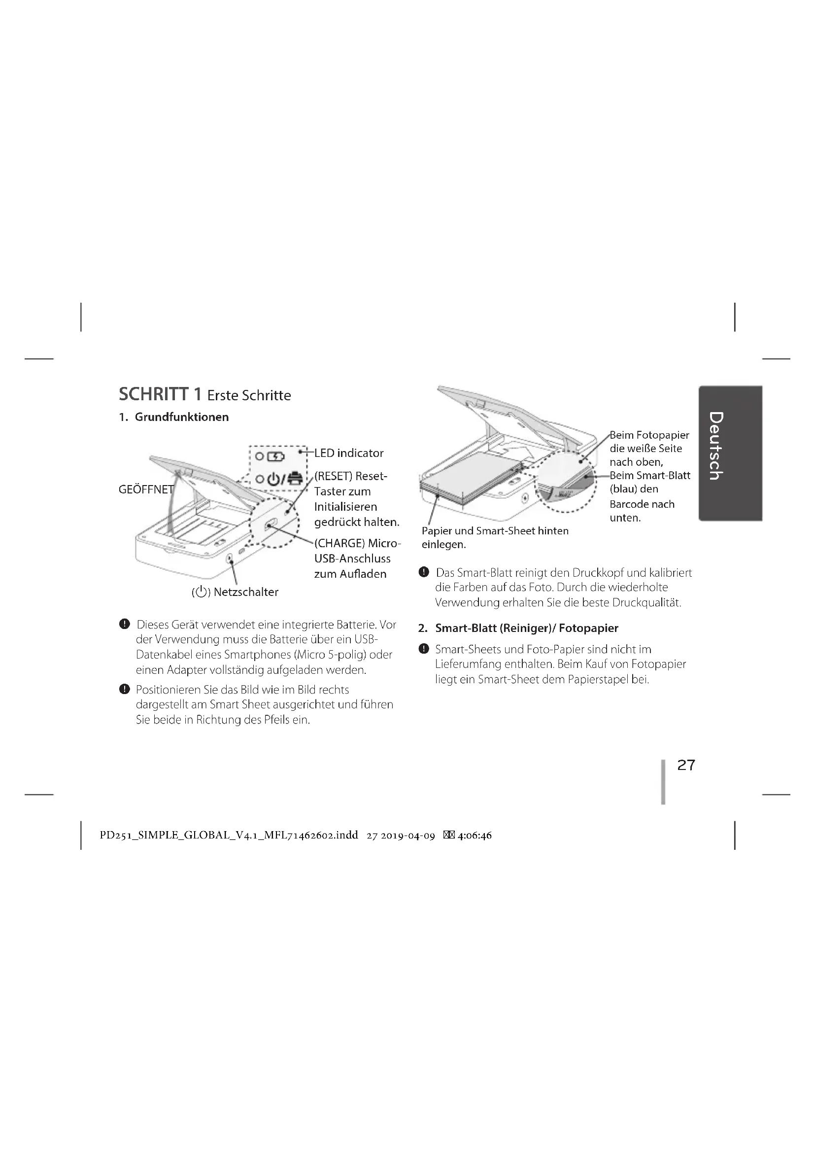 , Smart-Sheets und Foto-Papier sind nicht im Lieferumfang enthalten. Beim Kauf von Fotopapier liegt ein Smart-Sheet dem Papierstapel bei. Deutsch PD251_SIMPLE_GLOBAL_V4.1_MFL71462602.indd 27 2019-04-09 4:06:4628 Bei Verwendung eines Smart-Blattes sollte dieses gemeinsam mit dem Fotopapier in derselben Tasche verwendet werden.
