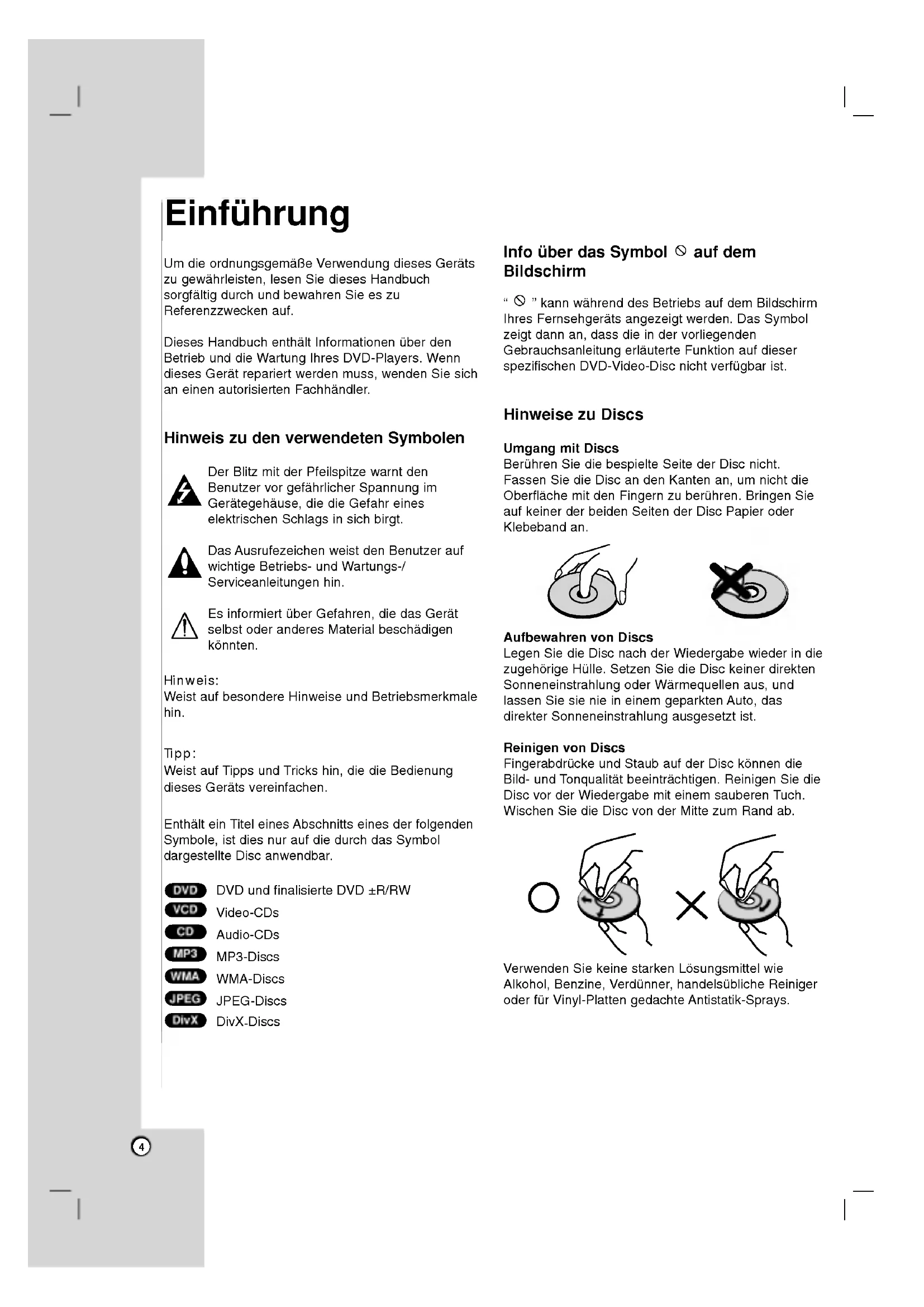 informiert uber Gefahren, die das Gerat selbst oder anderes Material beschadigen konnten. Hinweis: Weist auf besondere Hinweise und Betriebsmerkmale hin. Tipp: Weist auf Tipps und Tricks hin, die die Bedienung dieses Gerats vereinfachen. Enthalt ein Titel eines Abschnitts eines der folgenden Symbole, ist dies nur auf die durch das Symbol dargestellte Disc anwendbar. DVD und finalisierte DVD ±R/RW Video-CDs Audio-CDs MP3-Discs WMA-Discs JPEG-Discs DivX-Discs Info uber das Symbol auf dem Bildschirm kann wahrend des Betriebs auf dem Bildschirm Ihres Fernsehgerats angezeigt werden. Das Symbol zeigt dann an, dass die