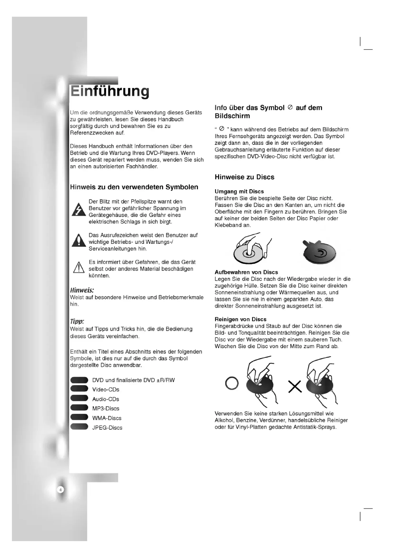 - Specifications Umdie ordnungsgemaße Verwendung diesesGeratszu gewahrleisten, lesenSiediesesHandbuch sorgfaltig durchundbewahrenSiees zuReferenzzweckenauf.DiesesHandbuchenthaltInformationenuberdenBetriebunddie Wartung Ihres DVD-Players. WenndiesesGerat repariert werdenmuss,wendenSiesichaneinenautorisiertenFachhandler. Hinweis den verwendeten Symbolen DerBlitzmitder Pfeilspitze warntdenBenutzervor gefahrlicher Spannung Gerategehause, die dieGefahreineselektrischen Schlags insich birgt. DasAusrufezeichenweistdenBenutzerauf wichtige Betriebs-und Wartungs-/ Serviceanleitungen hin.Esinformiertuber Gefahren, diedasGeratselbstoderanderesMaterial beschadigen konnten. Hinweis: WeistaufbesondereHinweiseundBetriebsmerkmalehin. Tipp: Weistauf Tipps undTricks hin, die die Bedienung diesesGeratsvereinfachen.EnthalteinTiteleinesAbschnittseinesder folgenden Symbole, istdiesnuraufdiedurchdas Symbol dargestellte Discanwendbar.DVDundfinalisierteDVD±R/RWVideo-CDsAudio-CDsMP3-DiscsWMA-DiscsJPEG-Discs Info uber das Symbol auf dem Bildschirm ""kannwahrenddesBetriebsaufdemBildschirmIhres Fernsehgerats angezeigt werden.Das Symbol zeigt dannan,dassdieinder vorliegenden Gebrauchsanleitung erlauterteFunktionaufdieser spezifischen DVD-Video-Discnicht verfugbar ist. Hinweise Discs Umgang mitDiscsBeruhrenSiedie bespielte SeitederDiscnicht.FassenSiedieDiscandenKantenan,umnichtdieOberflachemitden Fingern zuberuhren. Bringen SieaufkeinerderbeidenSeitenderDisc Papier oderKlebebandan.AufbewahrenvonDiscs Legen SiedieDiscnachder Wiedergabe wiederindie zugehorige Hulle.SetzenSiedieDisckeinerdirekten Sonneneinstrahlung oder Warmequellen aus,undlassenSiesie nieineinem geparkten Auto, dasdirekter Sonneneinstrahlung ausgesetzt ist. Reinigen vonDiscs Fingerabdrucke undStaubaufderDisckonnendieBild-und Tonqualitat beeintrachtigen. Reinigen SiedieDiscvorder Wiedergabe miteinemsauberenTuch.WischenSiedieDiscvonderMittezumRandab.VerwendenSiekeinestarken Losungsmittel wie Alkohol, Benzine, Verdunner, handelsubliche Reiniger oderfur Vinyl-Platten gedachte Antistatik-Sprays. JPEG WMA MP3 p. 254